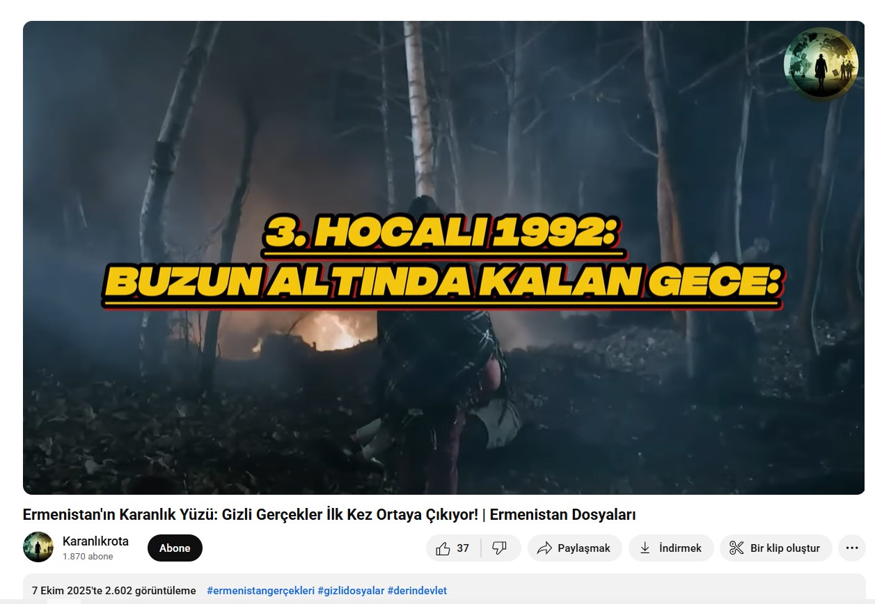 “Karanlıkrota”-da 7.10.2025 tarixində Ermənistanla bağlı video paylaşılıb. Həmin videoda 02:26-dan etibarən Xocalı soyqırımından bəhs edilir.