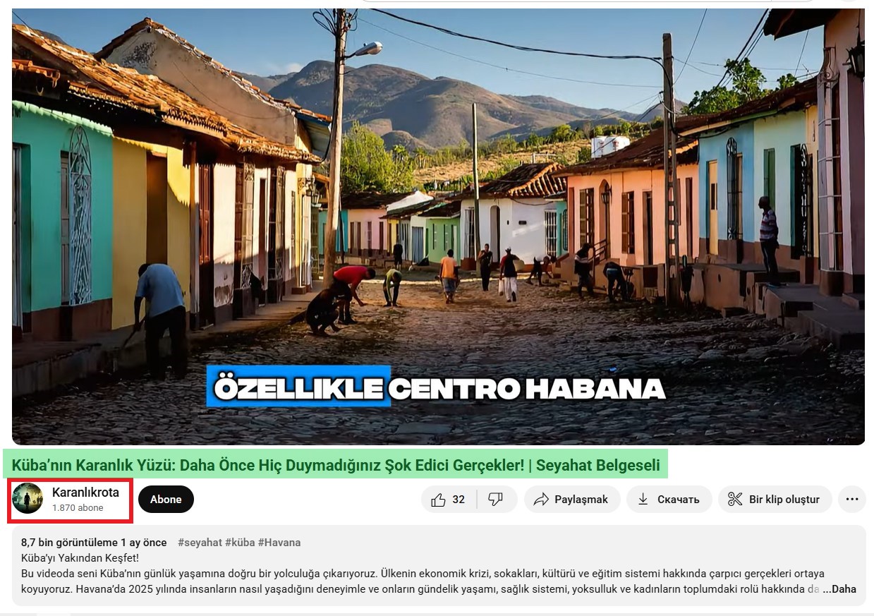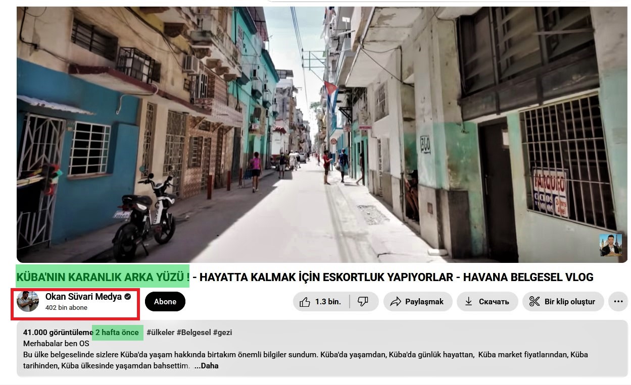 Kanala yerləşdirilən videoların təkli izlənməsi və araşdırılmasına başladıq və nəhayət, ipucu tapdıq. Belə ki, bu kanalda yayılan “Kubanın qaranlıq üzü: Daha əvvəl heç eşitmədiyiniz şok edən gerçəklər! Səyahət filmi” adlı videonun mövzu və kontent baxımından eynisinə əvvəllər Azərbaycanla bağlı qərəzli videolar çəkmiş erməni əsilli bloger Okan Süvarinin çəkdiyi “Kubanın qaranlıq arxa planı–həyatda qalmaq üçün ... edirlər” adlı videosunda rast gəldik.