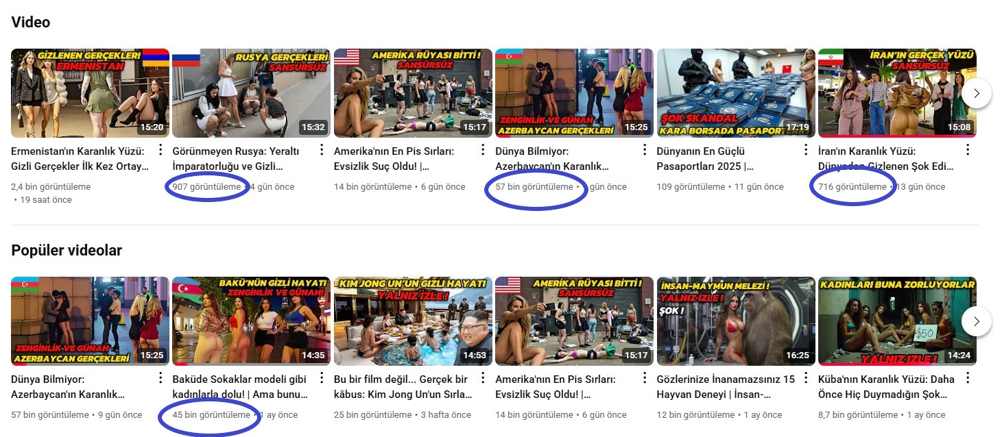 Okan Suvari maskasını dəyişərək hazırladığı bu video başdan-ayağa saxta, əsassız və məntiqsiz söz və kadrlarla doludur. Erməni əsilli bu şəxs əvvəllər olduğu kimi Azərbaycan haqda video hazırlayaraq, həm kanalını reklam edir, həm də anti-Azərbaycan təbliğatı aparır. Aşağıdakı skrinə diqqət edək. Rusiya ilə bağlı video cəmi 907, İranla bağlı video cəmi 716 baxış aldığı halda Azərbaycan haqda videolar (qondarma örtük fotoları ayrı mübahisə mövzusudur-red) 57 min, 45 min baxış toplayır.