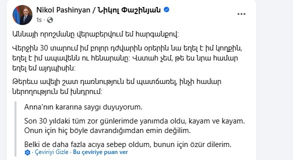 Ermənistan Baş naziri Nikol Paşinyan Anna Akopyanla münasibətlərinin pozulmasına münasibət bildirib.