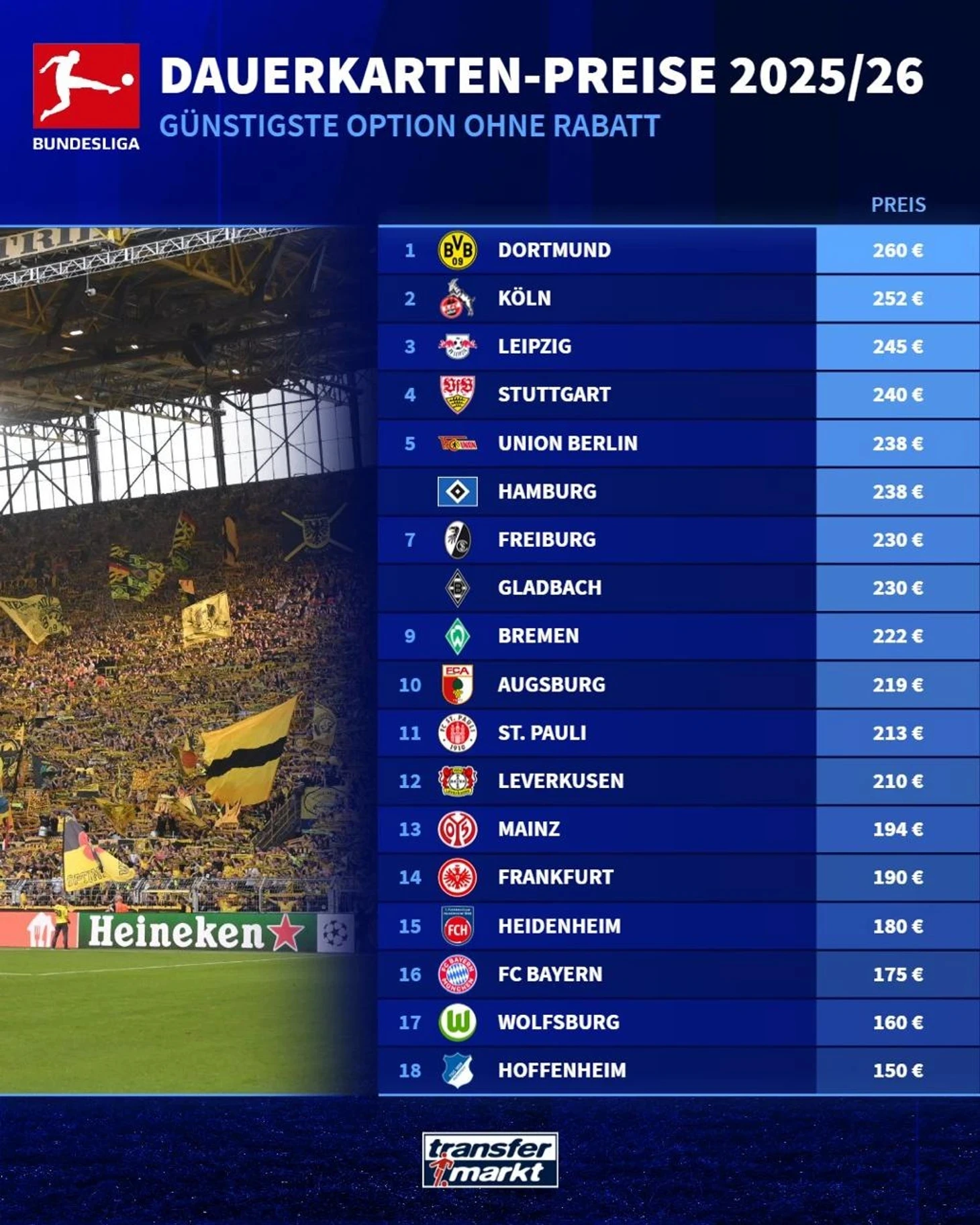 Almanların futbola nə qədər pul xərclədiyi barədə təsəvvür əldə etmək üçün bu mövsüm biletlərinin qiymətlərinə baxa bilərsiniz. Dortmundlular ən çox tələb edir - bütün ev oyunları üçün 260 avro. Yalnız “Hoffenhaym” və “Volfsburq” mövsüm biletlərini “Babariya”dan daha ucuz təklif edir.