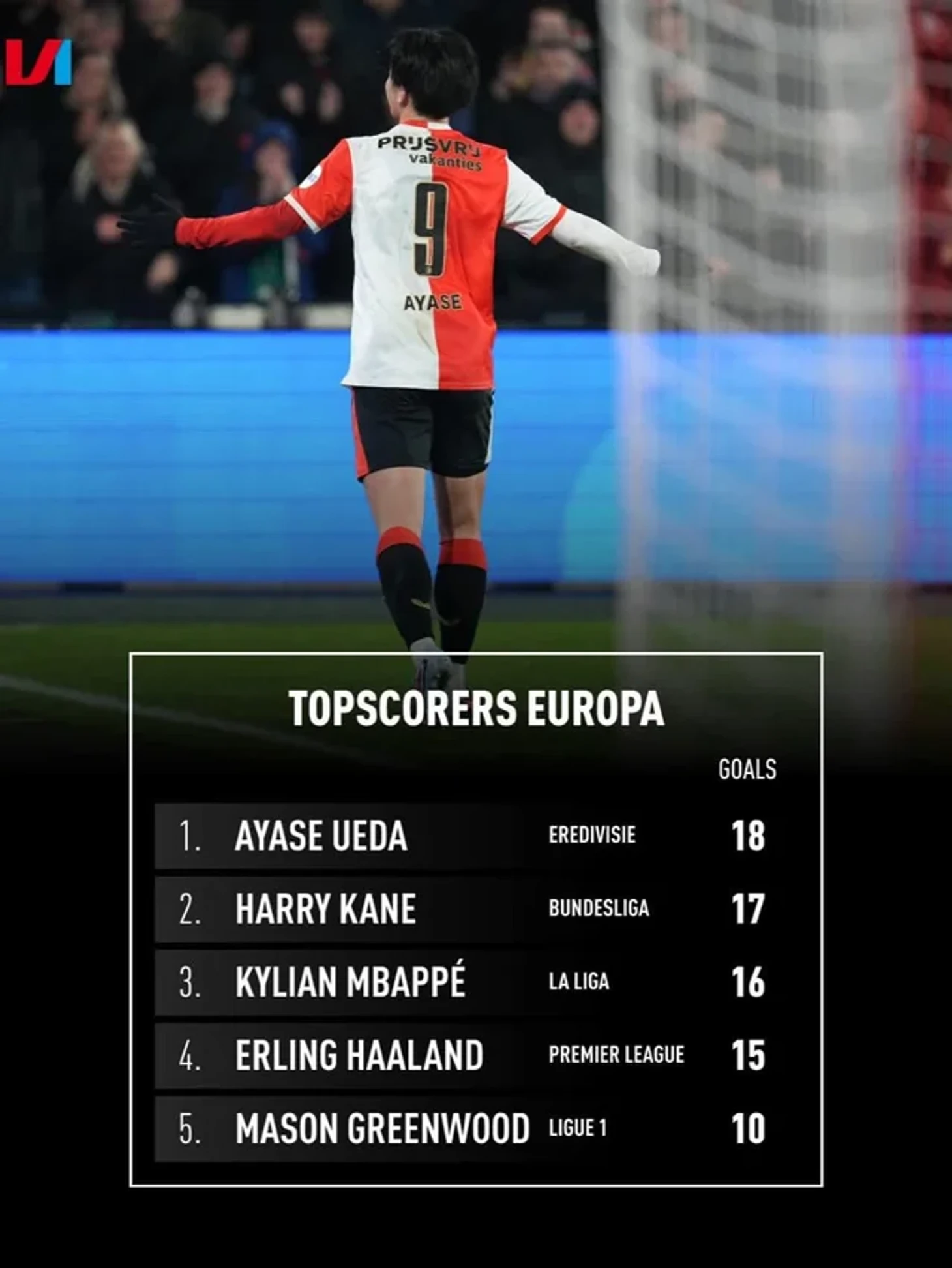 Bu artım Ayase Uedanın Bundesliqada 17 qolu olan Harri Keyni keçməsinə imkan verib, lakin o, cəmi 13 oyunda vurub. Onlardan bir qədər geridə "Real"dan Kilian Mbappe (16 qol), "Mançester Siti"dən Erlinq Haland (15 qol) və "Marsel"dən Meyson Qrinvud (10 qol) gəlir.