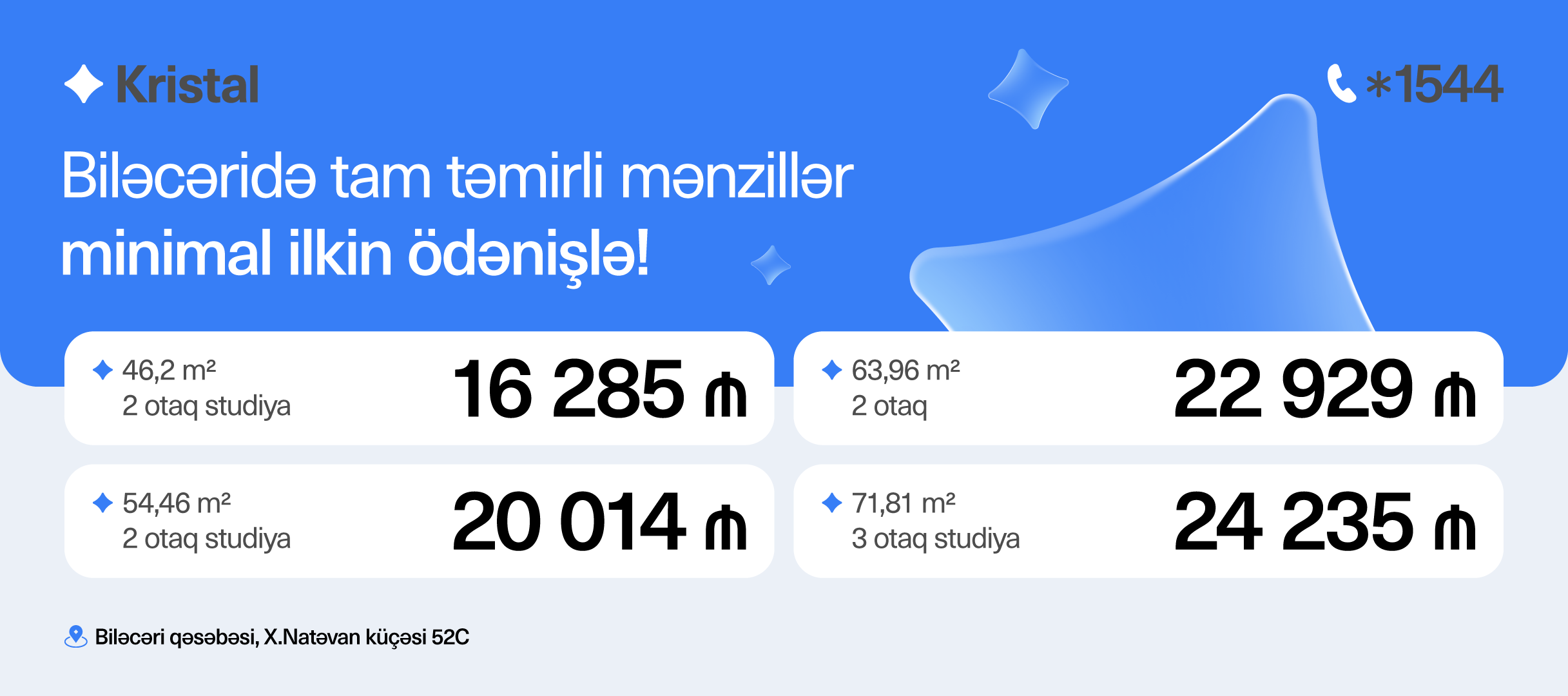 Yeni və müasir “Biləcəri” yaşayış kompleksində mənzil sahibi olmaq və ya sərfəli investisiya etmək istəyən hər kəs “Kristal”a müraciət edə bilər. 15% ilkin ödəniş fürsətindən yararlanın, yeni mənzilinizə doğru addım atın!