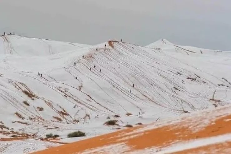 Əlcəzairin Ayn Sefra şəhərində, Saharanın şimal kənarında çəkilmiş fotolarda səhra təpələrinin qəfildən rənginin dəyişdiyi, narıncı əvəzinə ağ rəngə çevrildiyi görünür.