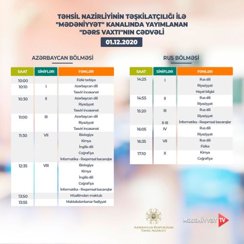 Lent.az məlumat verir ki, Təhsil Nazirliyi dərs cədvəlinə diqqət yetirməyi, mövzuları “Dərs vaxtı”nda öyrənməyi tövsiyə edir.