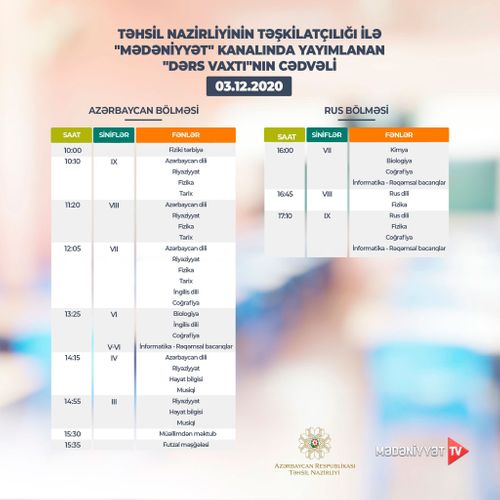 Lent.az məlumat verir ki, Təhsil Nazirliyi dərs cədvəlinə diqqət yetirməyi, mövzuları “Dərs vaxtı”nda öyrənməyi tövsiyə edir.