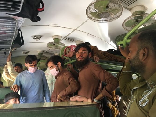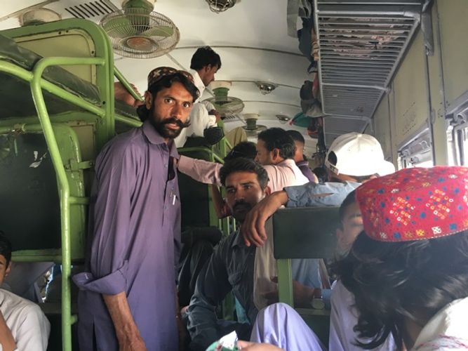 Çantamı, başım üstdəki baqaj hissədə boş yer tapmadığımdan, ayaqlarım arasında yerləşdirdim. Əyləşdiyim oturacaqla qarşıdakı arasında ağ rəngdə milli paltar - peruhan və tunban (uzunqol köynək və enli şalvar) geyinmiş, başına isə sarı və göy naxışlarla bəzədilmiş qırmızı rəngli Sindhi milli papağı – topi qoymuş cavan oğlan bir qutu üzərində oturduğundan, ayaqlarımı tam uzada bilmirdim.
