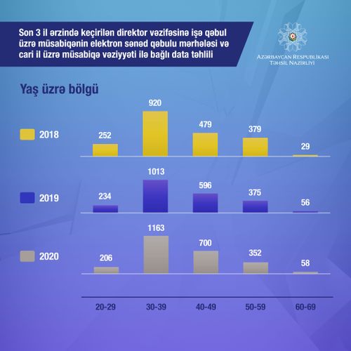 Son 3 il ərzində keçirilmiş direktor vəzifəsinə işə qəbul üzrə müsabiqədə 30-39 yaş aralığında olan namizədlər üstünlük təşkil edib. Belə ki, 2018-ci ildə 920 nəfər, 2019-cu ildə 1 013 nəfər, 2020-ci ildə 1 163 nəfər həmin yaş aralığında olan şəxslərdir.