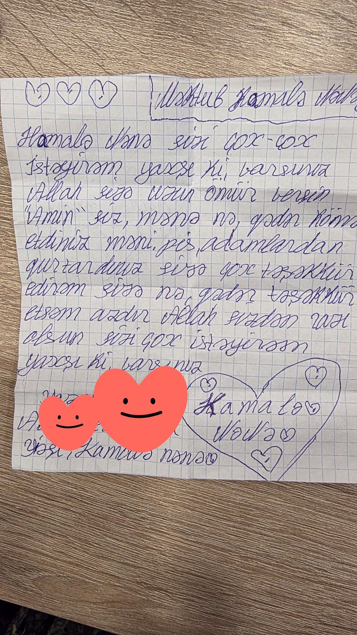 Azyaşlının müraciətinə dərhal Azərbaycan Respublikasının Daxili İşlər Nazirliyi İctimai Təhlükəsizlik Baş İdarəsi əməkdaşları,Səbayıl rayonu 8-ci polis bölməsi əməkdaşları, Səbayıl rayoni İcra Hakimiyyəti əməkdaşları, Ailə, Qadın və Uşaq Problemləri üzrə Dövlət Komitəsi ,eləcə də Sosial Xidmətlər Agentliyi əməkdaşları münasibət bildirərək onun yerləşdirilməsi istiqamətində Azərbaycan Uşaqları İctimai Birliyi ilə birgə iş apardılar.İlk olaraq azyaşlı xəstəxanada müayinə olundu və bu gün müəssisəmizə yerləşdirildi. Bu məktubu isə o xəstəxanada olarkən yazıb".