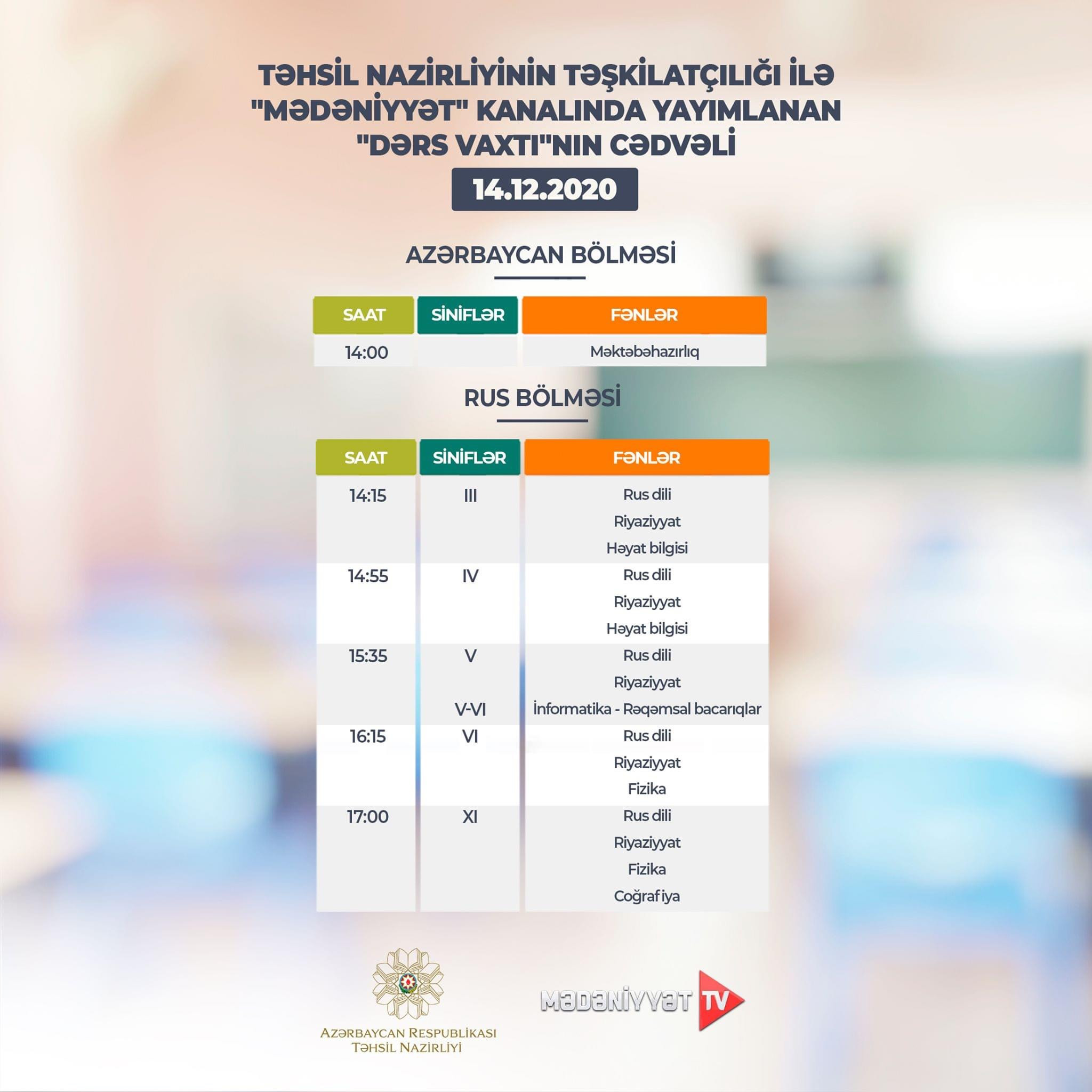 Təhsil Nazirliyi dərs cədvəlinə diqqət etməyi, dərsi “Dərs vaxtı”nda öyrənməyi tövsiyə edir.