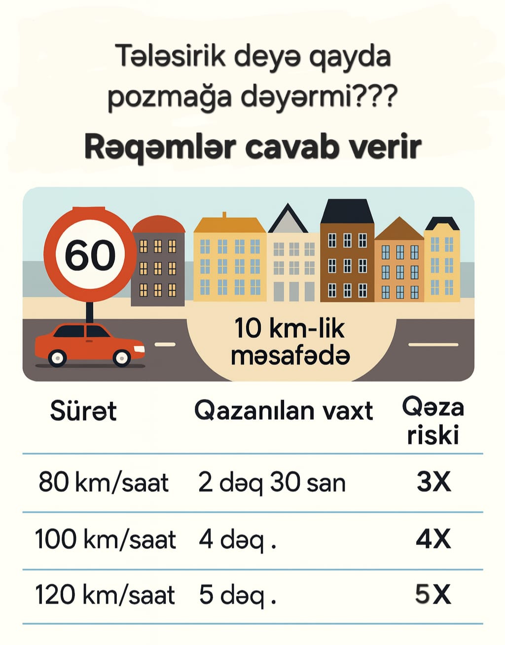 "Yollarda sürət həddinin aşılması çox vaxt “bir az tez çatmaq” düşüncəsi ilə əsaslandırılır. Lakin real rəqəmlərə baxdıqda bunun heç bir ciddi üstünlük vermədiyi aydın görünür".