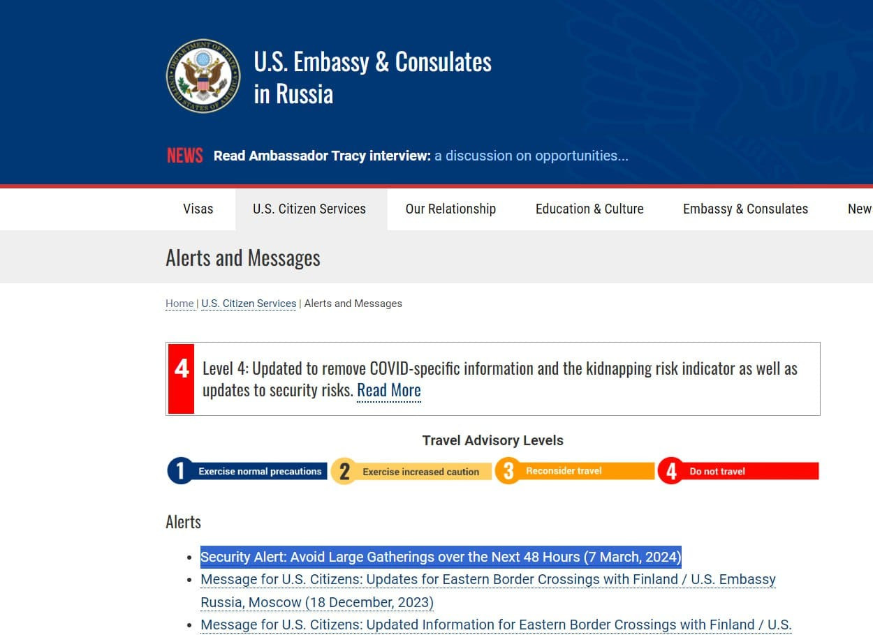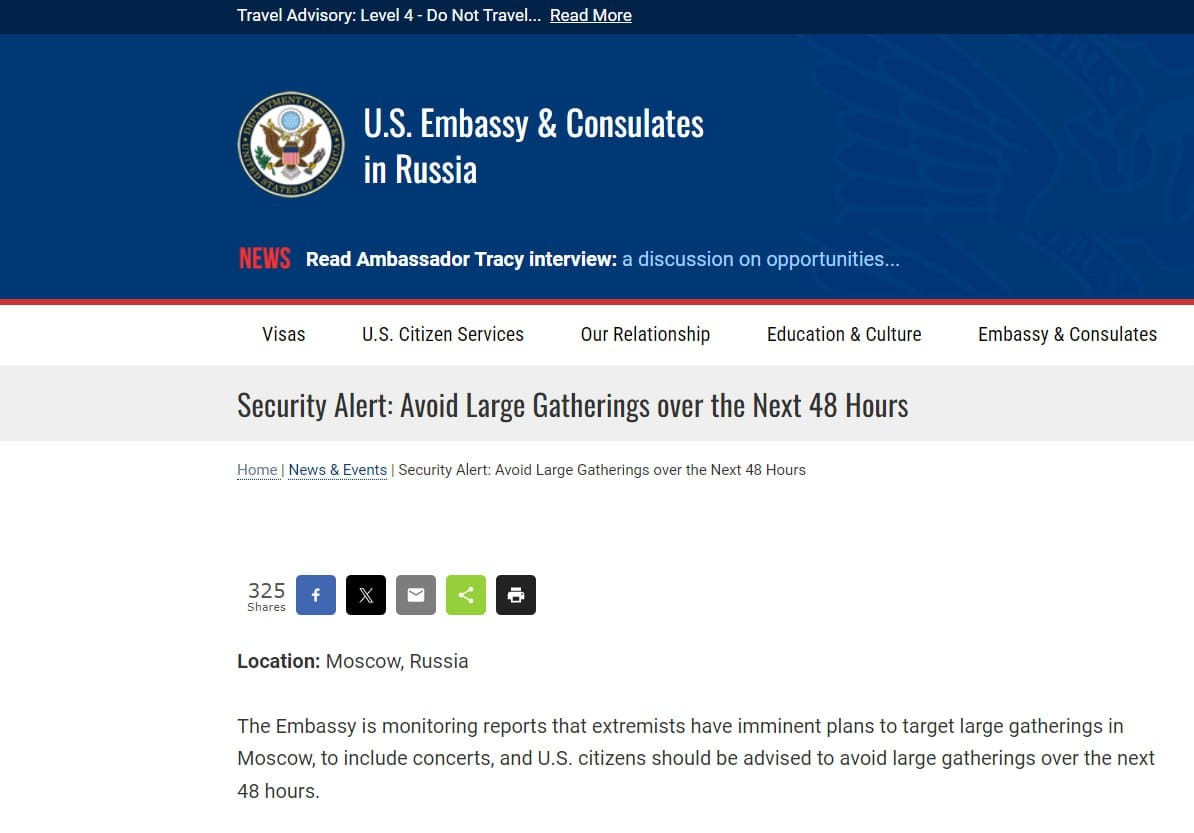 "Səfirlik ekstremistlərin Moskvada konsertlər də daxil olmaqla böyük toplantılara hücum etmək planlarının gözləndiyi barədə məlumatları izləyir və ABŞ vətəndaşlarına növbəti 48 saat ərzində böyük toplantılarda iştirakdan çəkinmələri tövsiyə olunur. İnsanların toplaşdığı yerlərdən qaçın. Yerli mətbuatda yenilənmələri izləyin. Öz ətrafınızdan məlumatlı olun", deyə xəbərdarlıqda bildirilib.