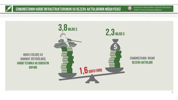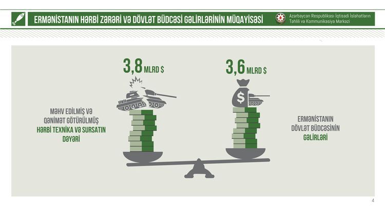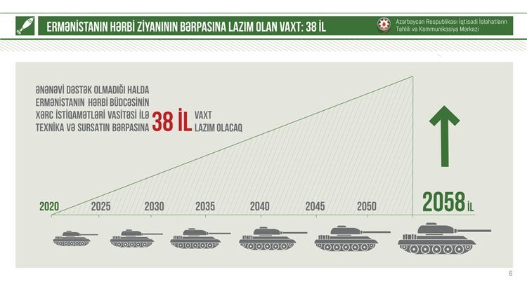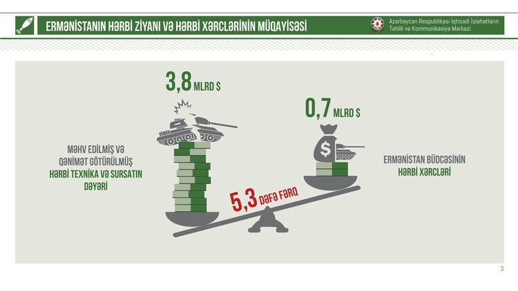 O həmçinin əlavə edib ki, 2020-ci il üzrə Ermənistanın hərbi istiqamətdə xərcləri 716 mln. dollar kimi təsdiq olunub. Ancaq Ermənistan cəmi 44 gün ərzində 1 il ərzində hərbi istiqamətdə əlavə olunacaq dəyərdən 5,3 dəfə çox hərbi ziyana uğrayıb. Bu baxımdan, hərbi xərcləmələr üzrə hesablamalar və iqtisadi göstəricilər Ermənistanın hazırkı hərbi büdcəsinin xərc istiqamətləri vasitəsi ilə hərbi infrastrukturu bərpa etməyə təxminən 38 il vaxt lazım olduğunu göstərir.