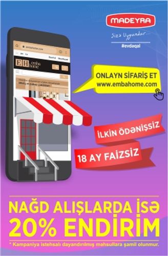 Hal – hazırda yalnız onlayn alışlarda müştərilərimiz bütün Madeyra mebellərini ilkin ödənişsiz, 18 ay faizsiz kreditlə əldə edə bilər, həmçinin nəğd alışlarda 20% endirimlərdən yararlana bilərlər. İstehsalı dayanmış məhsullar kampaniya şamil olunmur.