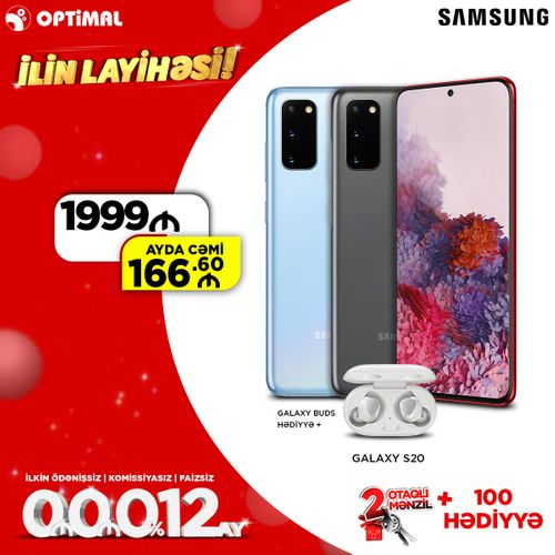 Samsung Galaxy S20 (8/128 GB, üçlü kamera) modelinə ayda cəmi 166.60 azn ödəməklə ilkin ödənişsiz, faizsiz, komissiyasız 12 aylıq kredit şərtləri ilə sahib olabilərsiniz.