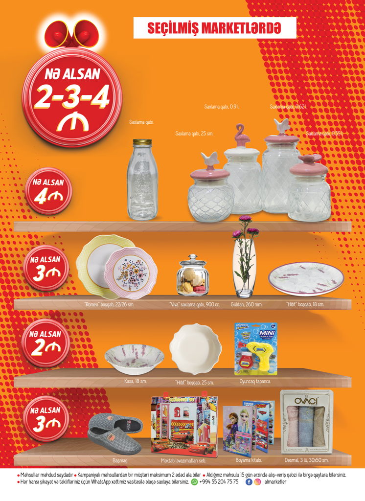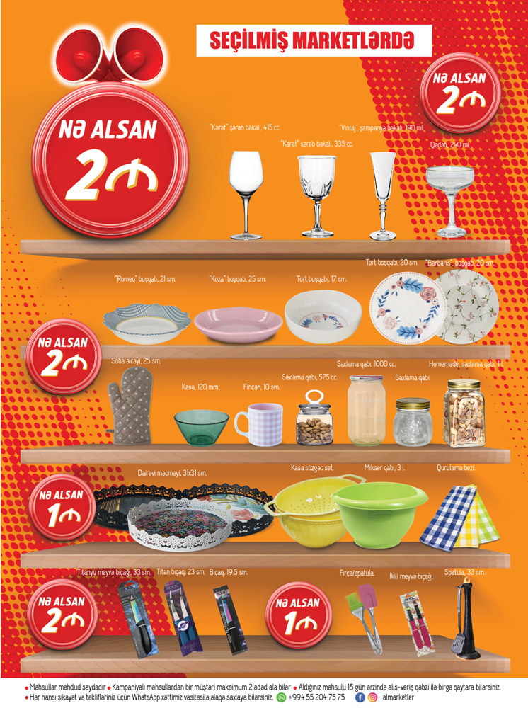 Ailənizin ehtiyacları üçün 20 May-10 İyun tarixlərində Al Marketlərə gəlin, siz də qazanın. Kampaniya günlərində süfrənizi bəzəyəcək dekorativ qablar,qonaqlarınızı zövqlə qarşılayacağınız boşqab, fincan və kasalar, su və çay stəkanlar, mətbəxinizdə rahatlıq yaradacaq elektrik əşyaları, saxlama qabları, plastik qablar, uşaqlar üçün oyuncaq və məktəb ləvazimatlarını 1,2,3,4 manatdan başlayan qiymətlərlə əldə edə bilərsiniz.