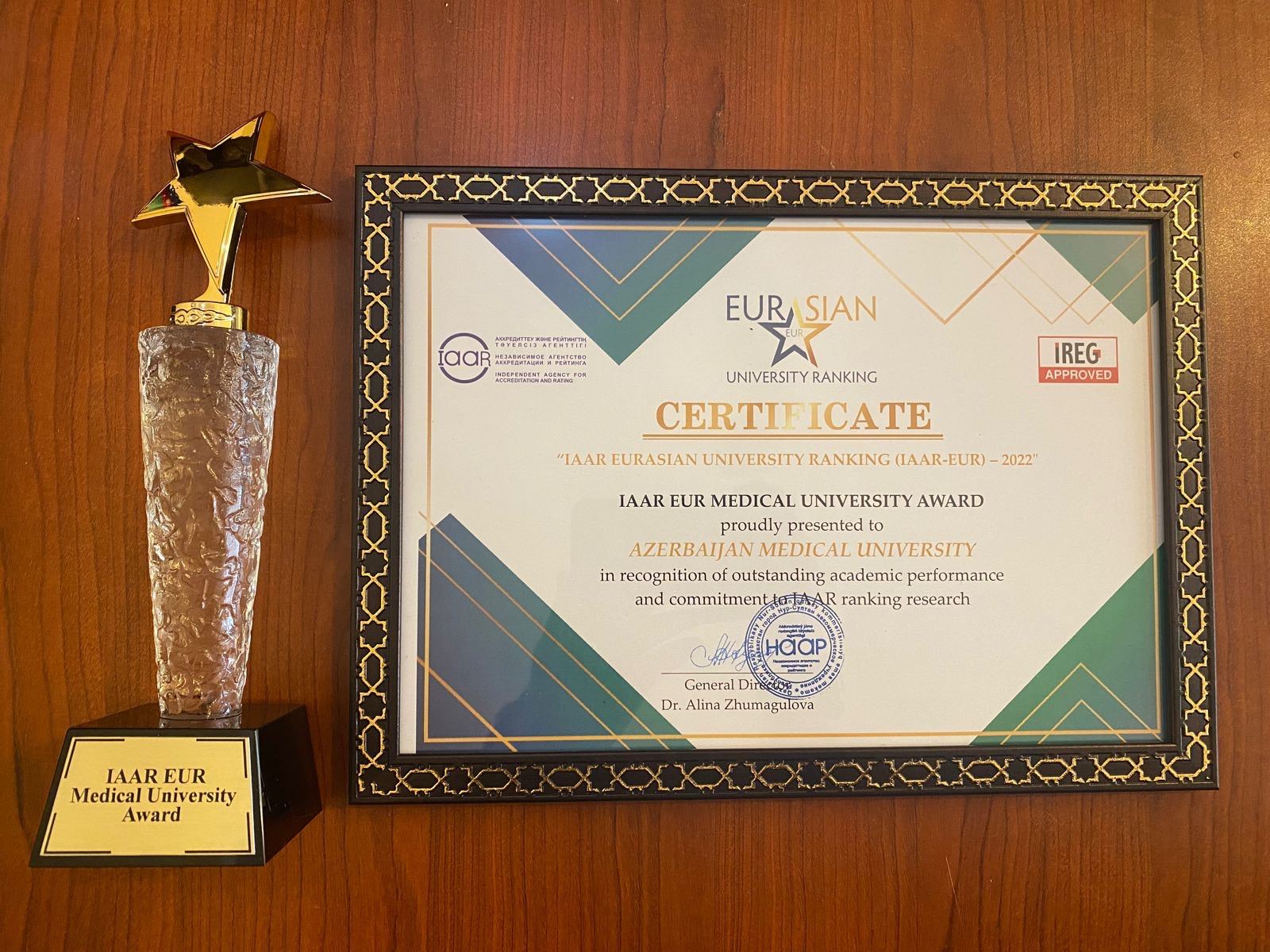 Beynəlxalq reytinqin nəticələrini əks etdirən sertifikat və mükafat Almatıda keçirilən VI Mərkəzi Asiya Beynəlxalq Forumunda Azərbaycan Tibb Universitetinin rektoru, professor Gəray Gəraybəyliyə təqdim olunub.