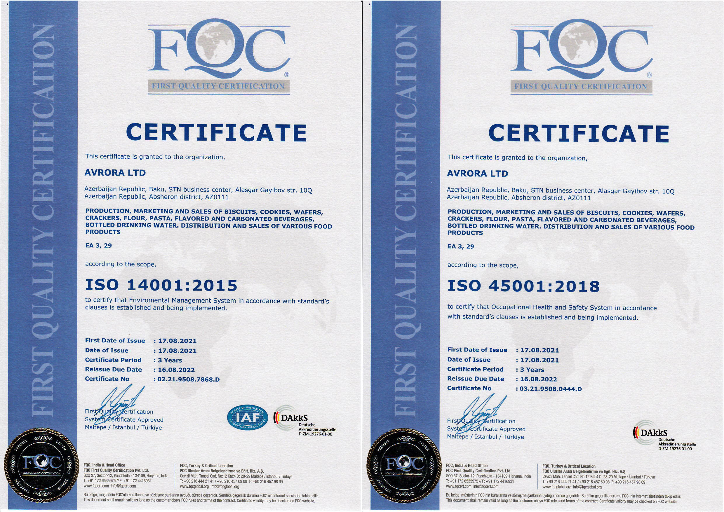 Avrora Qrup istehsal müəssisələrində ətraf mühitin qorunması, əməkdaşlarının daha sağlam və təhlükəsiz şəraitdə çalışması üçün səylərini davam etdirir. Bütün bunların uğurlu nəticəsi olaraq şirkət İSO 14001:2015 “Ətraf mühiti idarəetmə sistemi” və İSO 45001:2018 “Peşə sağlamlığı və təhlükəsizliyinin idarəedilməsi sistemi” beynəlxalq sertifikatlarına layiq görülüb.
