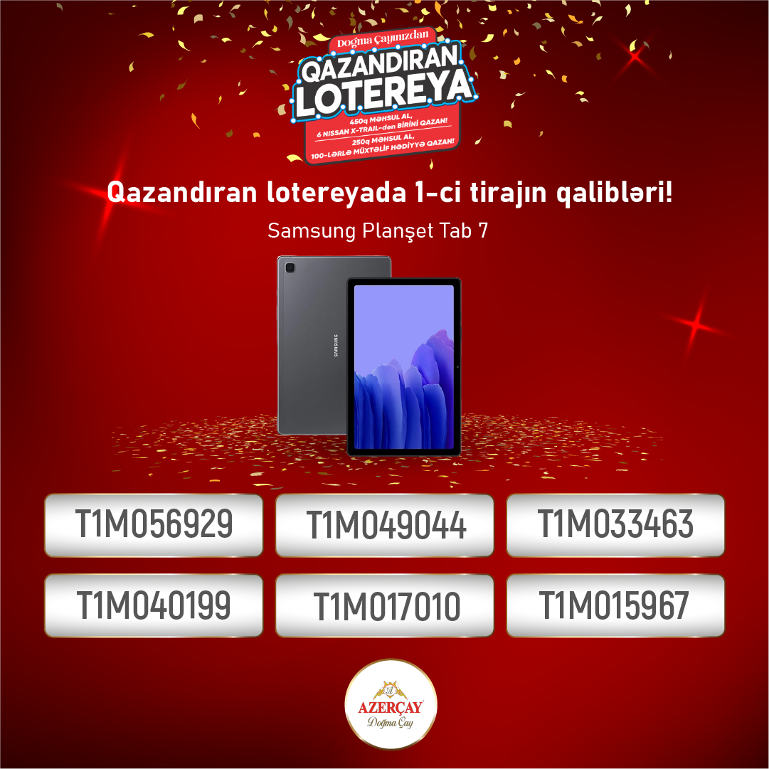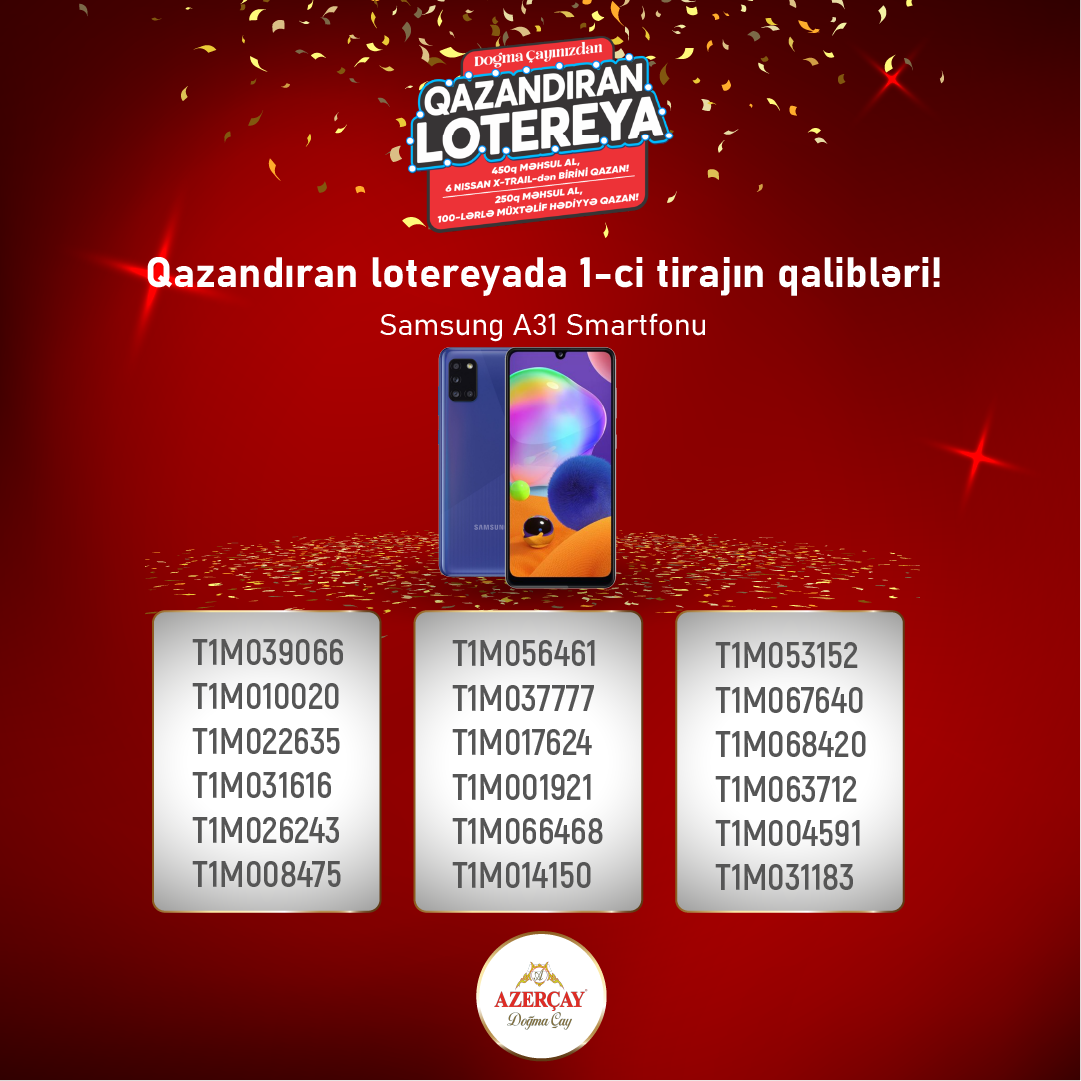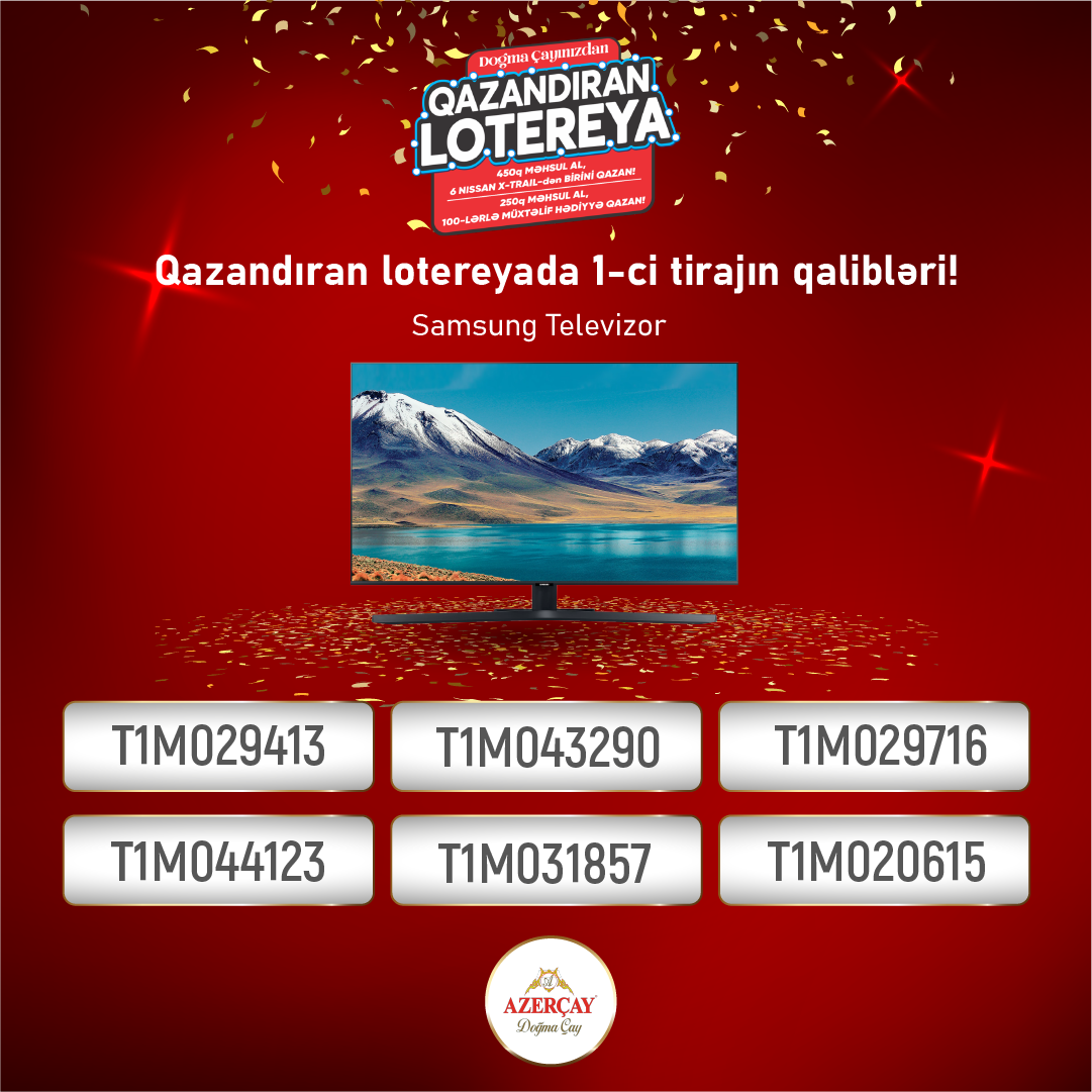 “Azerçay” markası tərəfindən təşkil edilən “Doğma çayınızdan qazandıran lotereya”nın ilk tirajı baş tutub. ATV telekanalında canlı yayımlanmış lotereyada uduş fonduna daxil olan 6 Nissan X-Trail avtomobilindən ikisi və yüzə yaxın müxtəlif hədiyyə sahibini tapıb. Avtomobilləri qazanmış kupon nömrələri aşağıdakı kimidir: