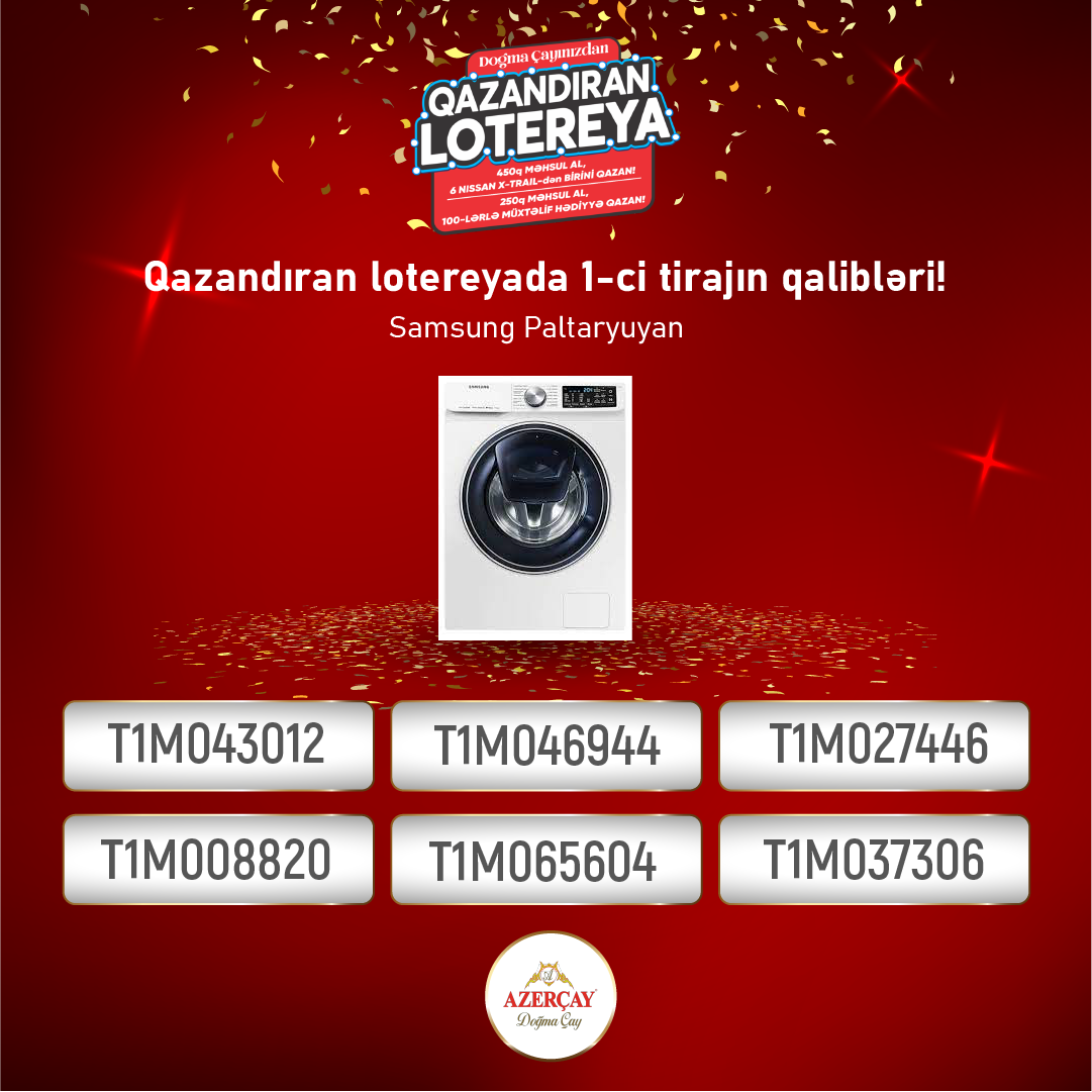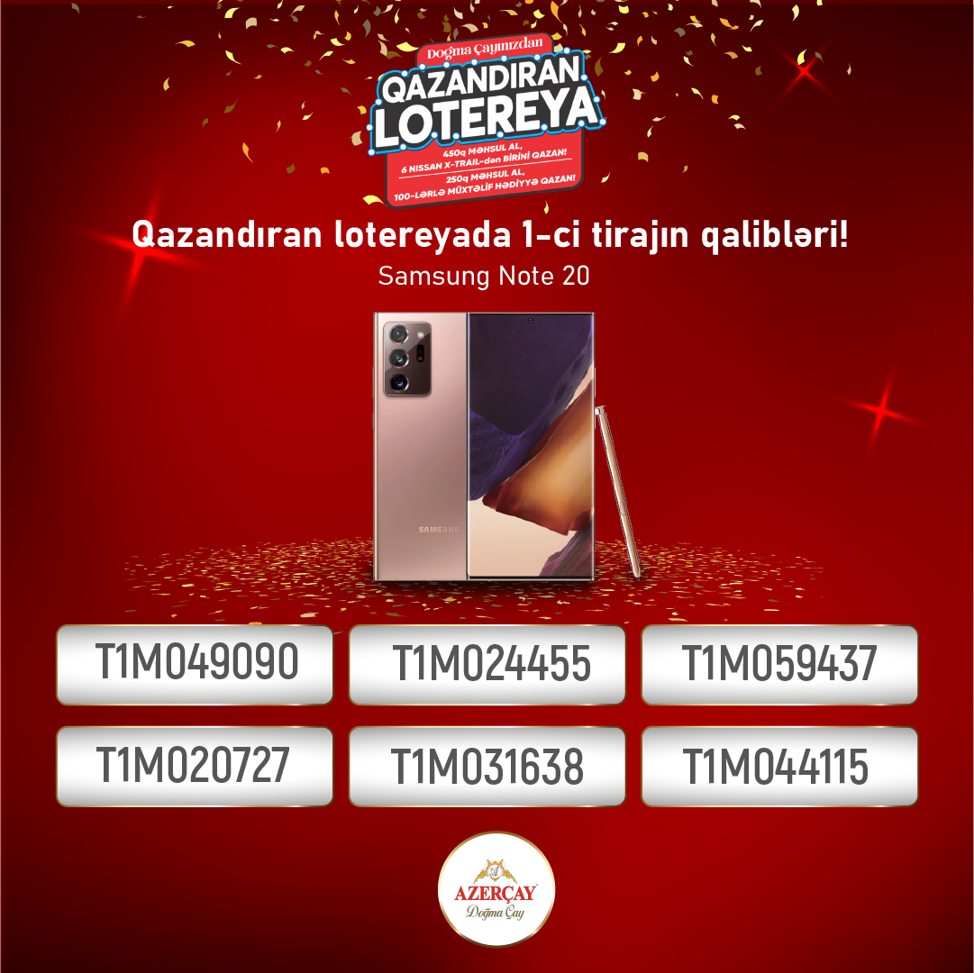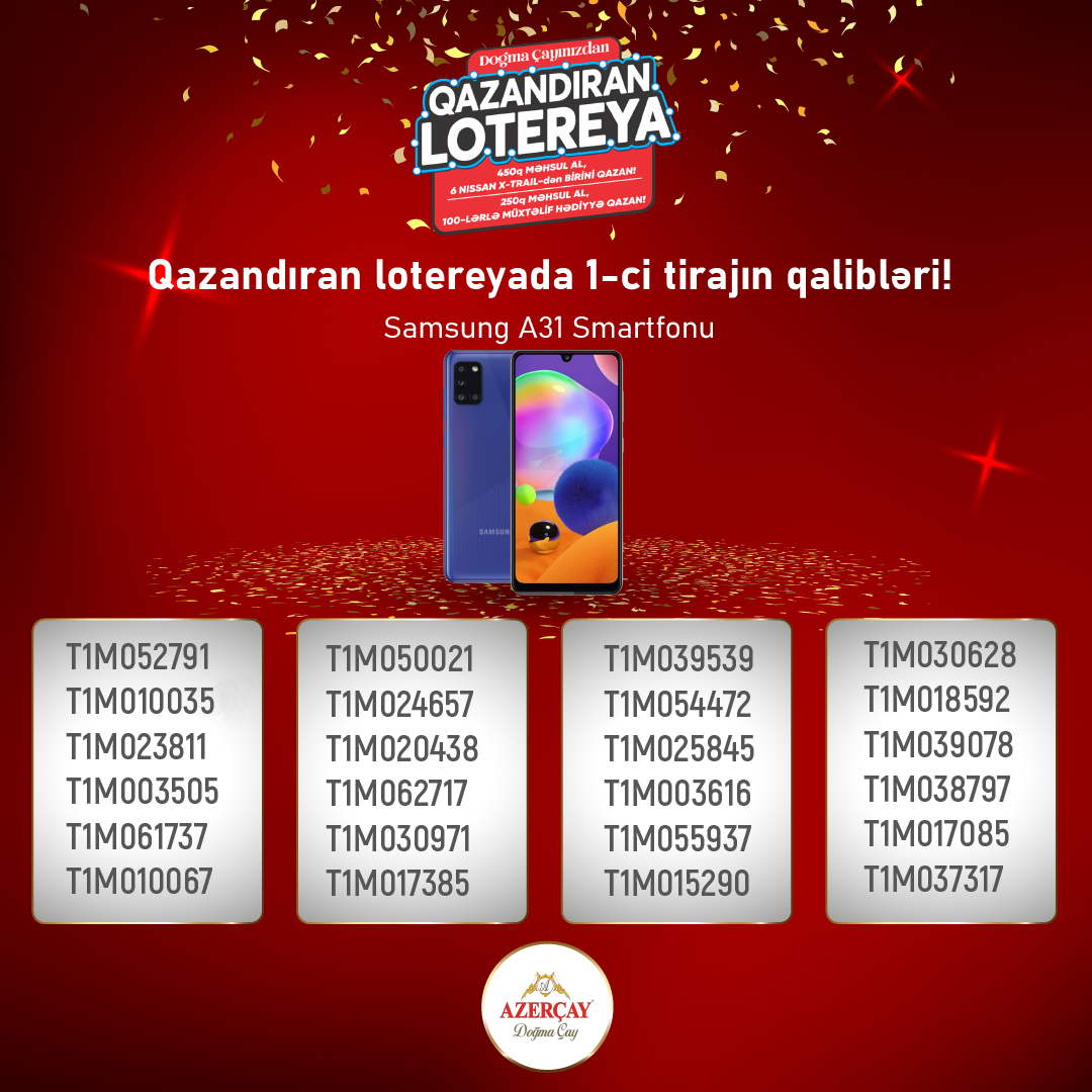 “Azerçay” markası tərəfindən təşkil edilən “Doğma çayınızdan qazandıran lotereya”nın ilk tirajı baş tutub. ATV telekanalında canlı yayımlanmış lotereyada uduş fonduna daxil olan 6 Nissan X-Trail avtomobilindən ikisi və yüzə yaxın müxtəlif hədiyyə sahibini tapıb. Avtomobilləri qazanmış kupon nömrələri aşağıdakı kimidir: