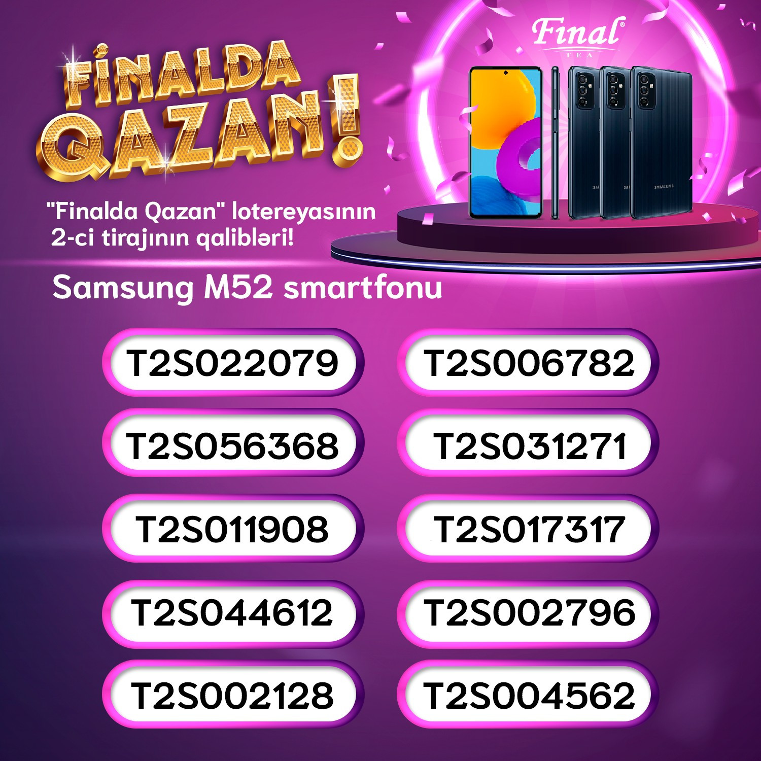 “Final çay iç, Finalda qazan!” lotereyası 15 sentyabr-31 dekabr müddətində keçirilir. Üçüncü tirajın qalibləri isə məşhur aparıcı İlkin Həsəninin təqdimatında 5 yanvar 2023-cü tarixində “Xəzər” telekanalında canlı yayımda elan olunacaq. Növbəti 3 ədəd Volkswagen Polo, 60 ədəd Samsung M52 smartfonu öz sahibini tapacaq. Bununla bərabər, qaliblərin siyahısı müxtəlif media orqanlarında, sosial media hesablarında və finaldaqazan.az saytında yayımlanacaq.