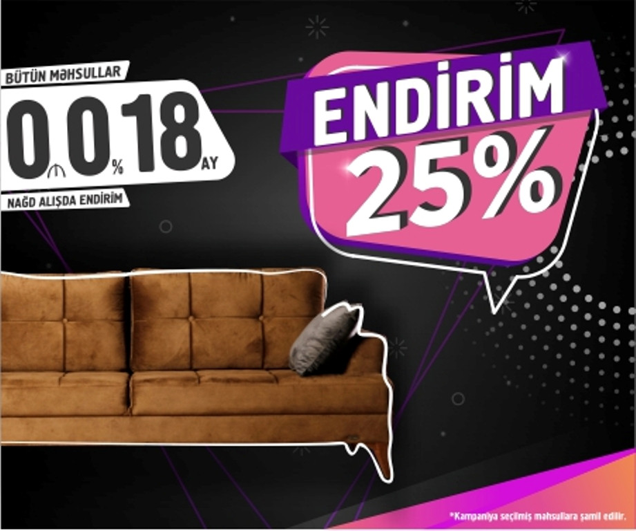 Hal-hazırda müştərilərimiz seçilmiş bir çox "Madeyra" mebellərini , nəgd alışlar zamanı 25 % endirimlə əldə edəcəklər, həmçinin 18 ay Faizsiz kreditlərdən faydalana biləcəklər.