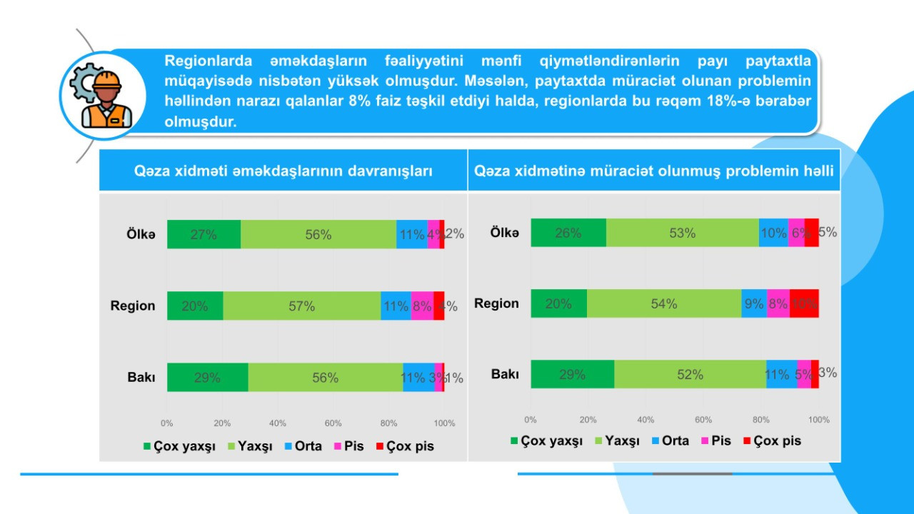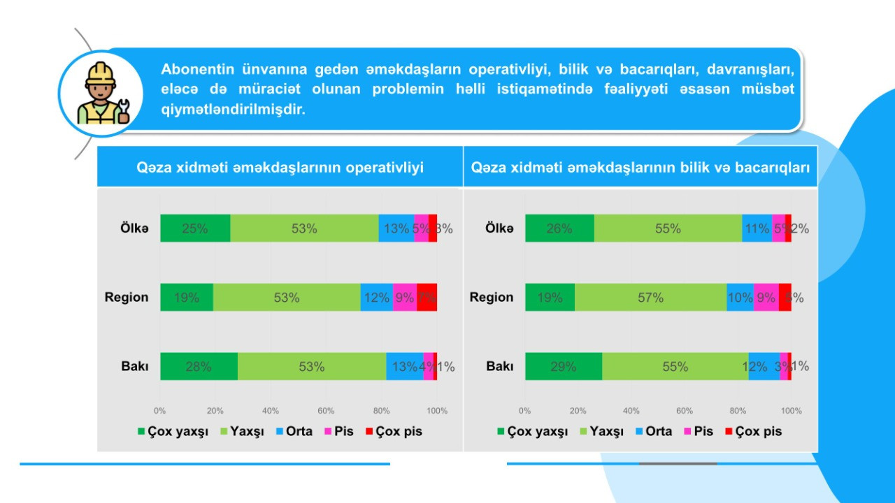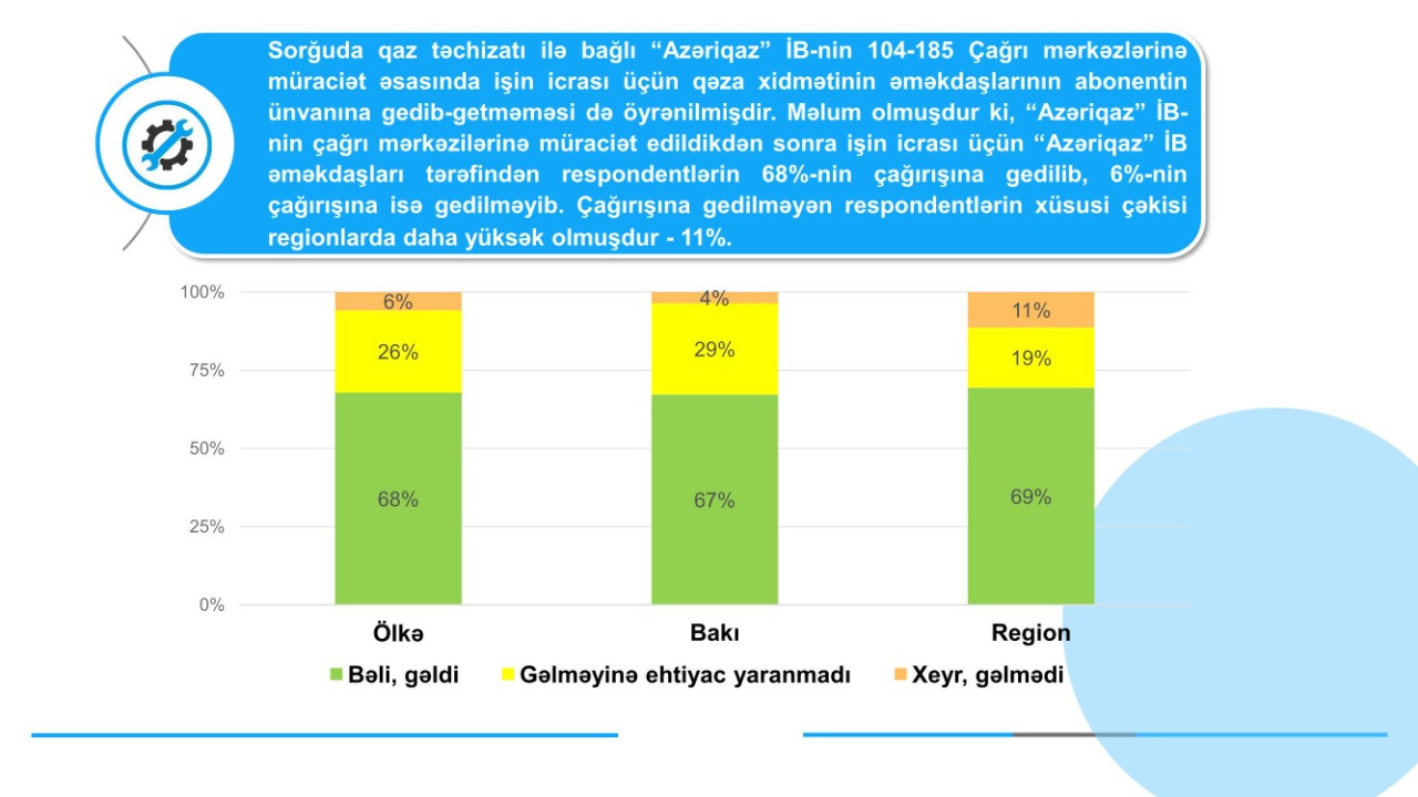 Lent.az xəbər verir ki, sorğuda qaz təchizatı ilə bağlı “Azəriqaz” İB-nin 104/185 Çağrı mərkəzlərinə müraciət əsasında işin icrası üçün qəza xidmətinin əməkdaşlarının abonentin ünvanına gedib-getməməsi, eyni zamanda abonentin ünvanına gedən əməkdaşların operativliyi, bilik və bacarıqları, davranışları, eləcə də müraciət olunan problemin həlli istiqamətində fəaliyyəti qiymətləndirilib. Sorğunun nəticələri barədə diaqramlarda ətraflı məlumat göstərilib.