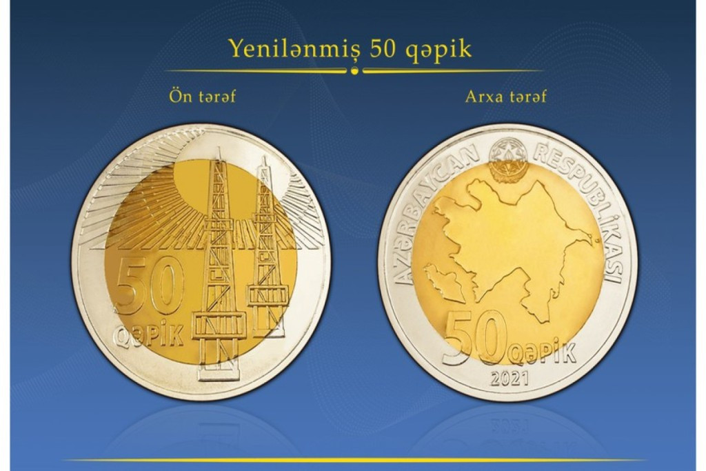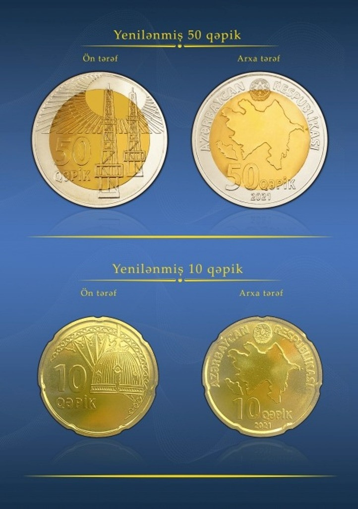 Azərbaycan Respublikasının Mərkəzi Bankı (AMB) tərəfindən 10, 20 və 50 qəpiklik metal pul nişanlarının dizaynına Dövlət Gerbi və istehsal ili əlavə olunaraq yenilənməsi həyata keçirilib.