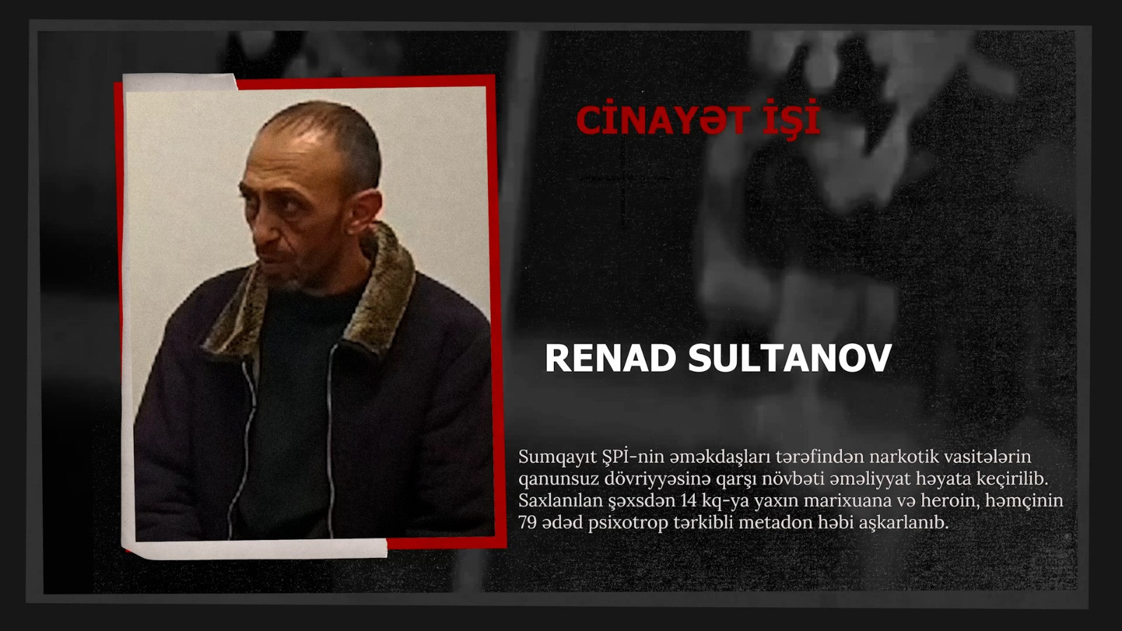 Sumqayıt şəhər Polis İdarəsinin əməkdaşları tərəfindən narkotik vasitələrin qanunsuz dövriyyəsinə qarşı keçirilən növbəti əməliyyat zamanı əvvəllər də eyni cinayət əməlinə görə məhkum edilmiş 44 yaşlı Renad Sultanov saxlanılıb.