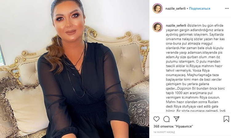 “Bu gün efirdə yaşanan gərgin adlandırdığınız anlara aydınlıq gətirmək istəyirəm. Ünvanıma nalayiq sözlər yazan hər kəs ona-buna pul atmaqla məşğul olanlardır. Hər zaman belə olub ki, pulu verəndə yaxşı adamsan, istəyəndə isə pis olursan. Öz pulumu istəmişəm. O pulu məndən təcili alıblar ki, Röyaya (Xalq artisti Röya Ayxan - red.) mahnını hazır təhvil verməliyik, yoxsa oxumayacaq. Məşhurlaşmağa təzə başlayanlar kimi mən də bəzi xərclər çəkmişəm bu yerlərə gələnə qədər. 8 il bundan əvvəl 1000 manat borc tapıb aranjimana pul vermişəm ki, mahnımı Röya oxusun. Mahnı hazır olandan sonra Ruslan dedi ki, “Röya studiyaya vaxt edib gələ bilmir”. Bir sözlə oxumağa gəlmədi. İndi özümə maraqlıdır ki, görəsən heç Röyanın bundan xəbəri var? Mahnı 7 il yatdı. Bir gün Ruslan zəng etdi ki, “bəstəni Aynur Dadaşovaya 1500-ə verdim”. Dedim bəs “Röya nə oldu?”. Dedi, gəlmədi oxumağa. Ucuz satdım ki, sənin pulun batmasın. Pulu soruşanda isə cavab verdi ki, Aynur verməyib.