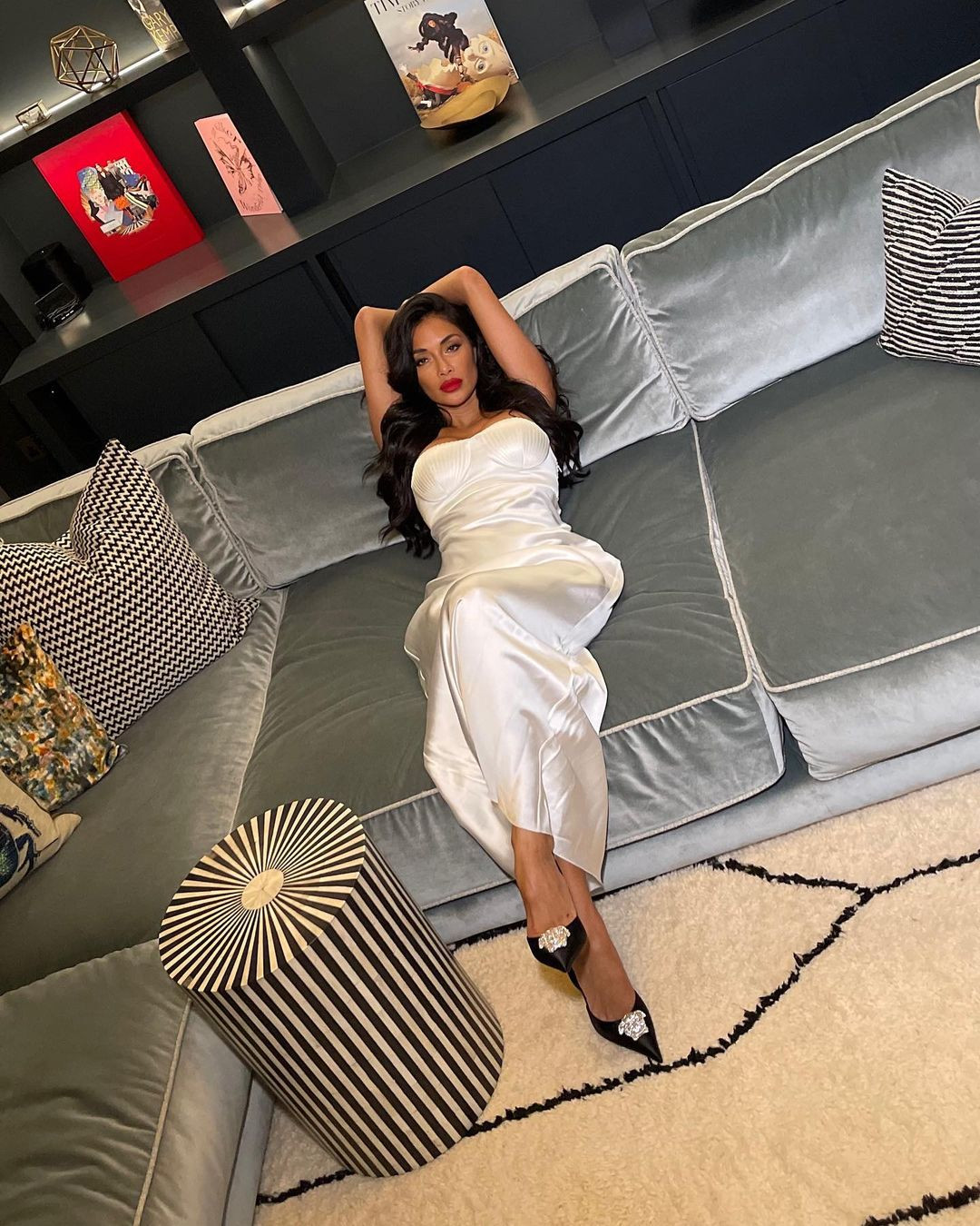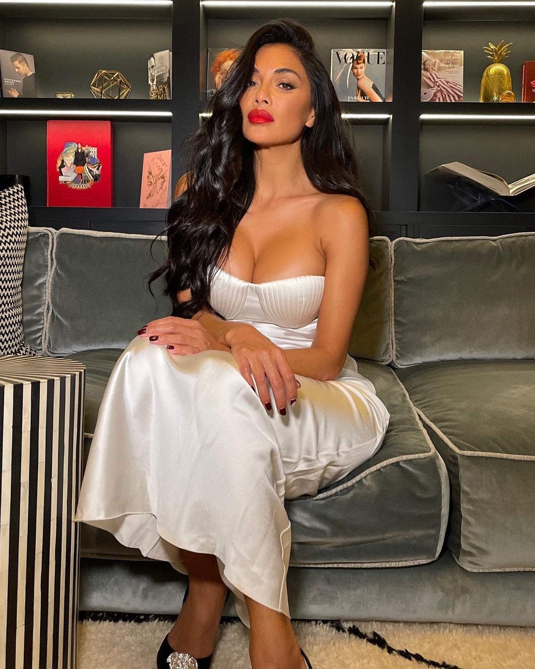 44 yaşlı məşhur öz evində dərin dekolteli ağ uzun libas və qara hündürdaban ayaqqabı ilə şəkil çəkdirib.