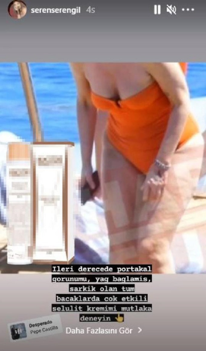 Belə ki, S.Serengil G.Ergenin olduğu bilinən, ancaq üzü görünməyən şəkli paylaşaraq, altından “Artıq dərəcədə portağal görünüşü, yağ bağlamış, sallanıqlıq olan bütün ayaqlarda çox təsirli sellülit kremimi mütləq yoxlayın” şərhini yazıb.