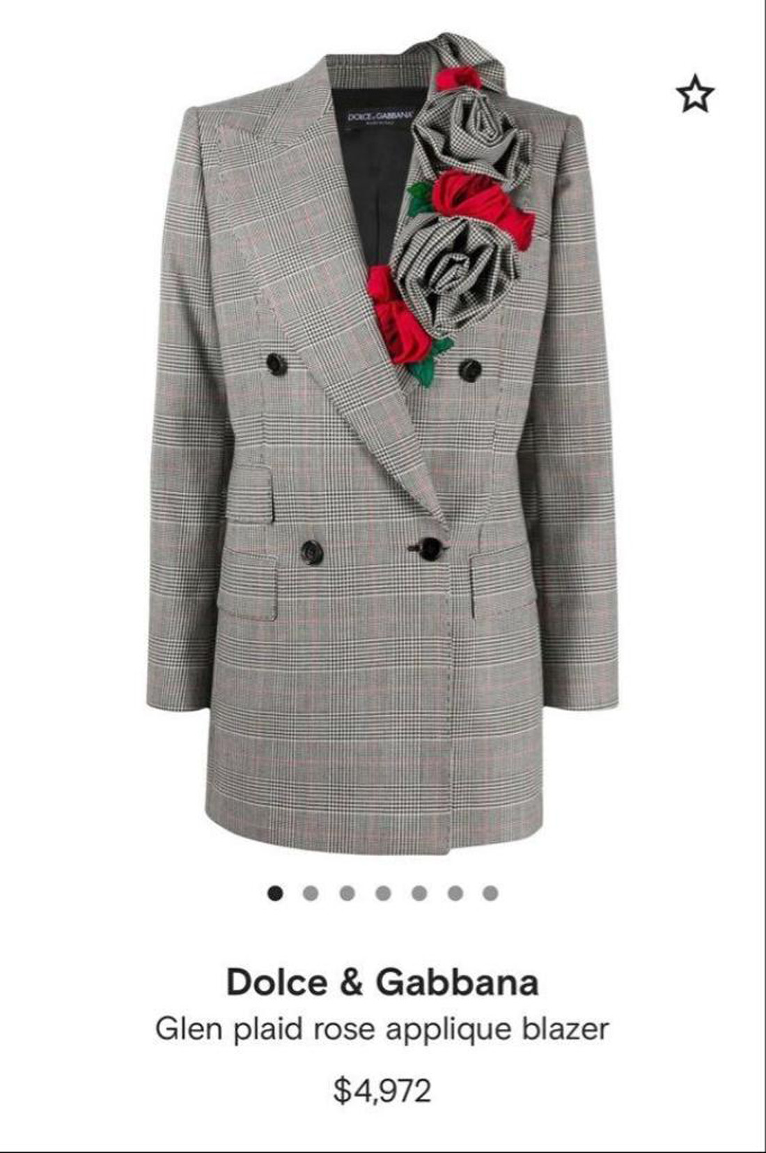 Müğənninin sinəsi güllərlə bəzədilən pencəyinin qiyməti 4972 dollar, təxminən 8452 manatdır. A.Kazımovanın seçdiyi qara rəngli sözügedən brendin çəkməsi isə 1195 dollar, təxminən 2095 manatdır. İfaçı pencək və ayaqqabısına birlikdə 10547 manat ödəyib. / axşam.az