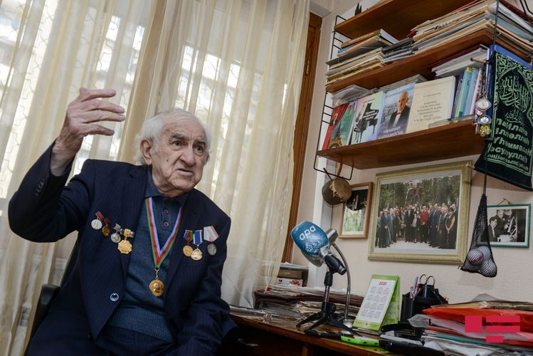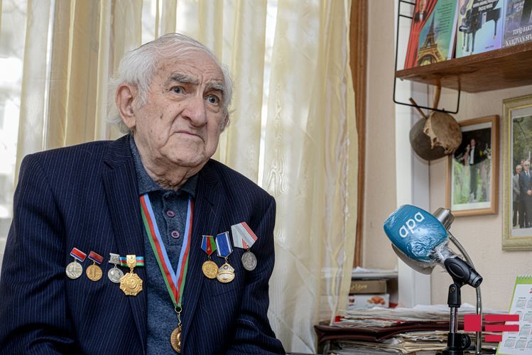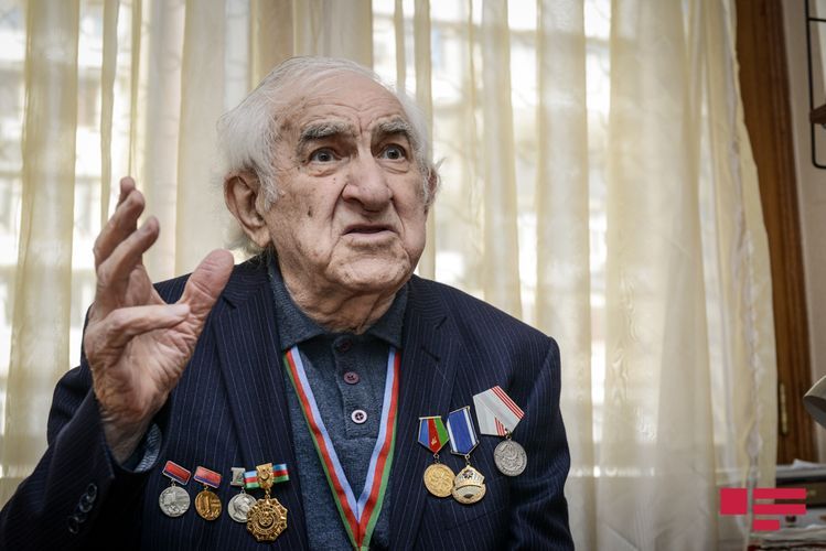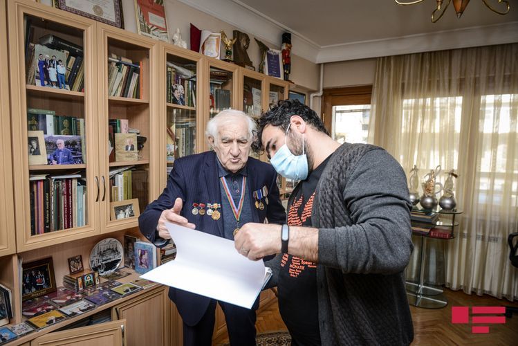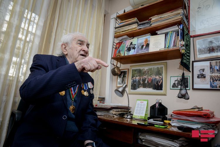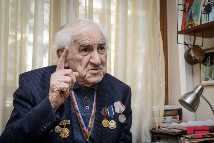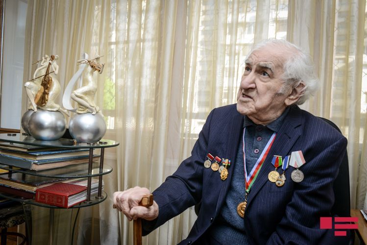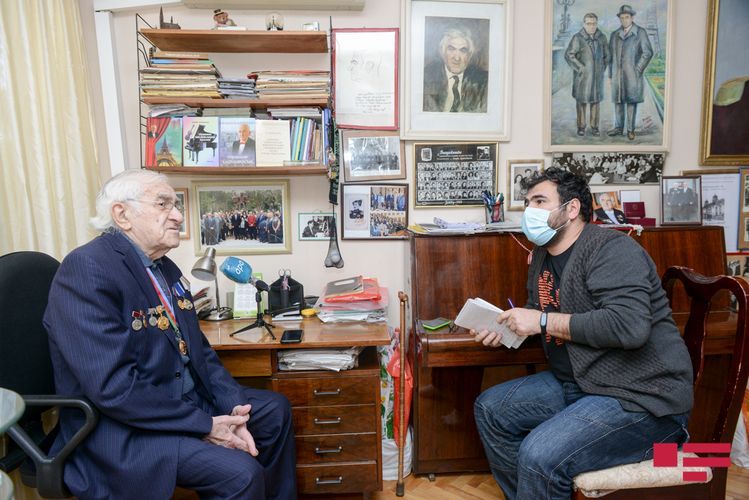 Lakin maestro fotolarının da çəkiləcəyini eşidəndə ev paltarında müsahibə verməyə razılaşmır. Gözləməyi xahiş edib doxsan yaşı ilə heç cür uyuşmayan cəld addımlarla yan otağa keçib hazırlaşmağa başlayır. Budur, beşcə dəqiqə çəkməmiş geyimli-kecimli qarşımızda dayanıb, sinəsində də hərəsi ömrünün bir fərəhli anına şahidlik etmiş orden - medallar. Və müsahibəyə başlaya bilərik.