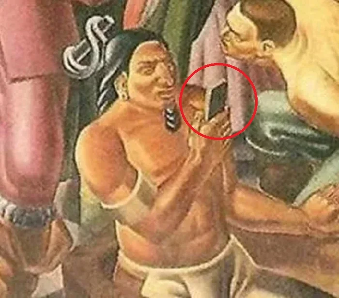 Şəkildə XVII əsrdə yaşamış hindular təsvir olunub. Onlardan biri əlində smartfona bənzəyən əşyaya diqqətlə baxır. Elə həmin freskanı gündəmə gətirən də məhz bu detaldır.