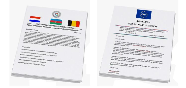 Niderland-Belçika Azərbaycanlıları Koordinasiya Şurasının məktubunda bildirilib ki, 8 mart – Beynəlxalq Qadınlar günündən bir qədər sonra baş verən bu insident Azərbaycan qadınına şiddət və vandalizm aktı kimi qiymətləndirilir: “Bu, yolverilməzdir və günahkarların tapılıb cəzalandırılması üçün təcili tədbirlərin görülməsini xahiş edirik”.