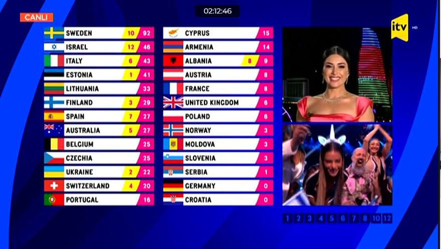 Lent.az xəbər verir ki, ölkəmiz ən yüksək 12 xalı İsrailə verib.