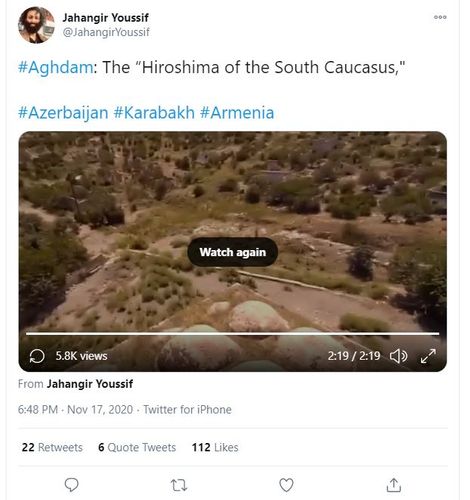 Lent.az xəbər verir ki, fotoqraf həmin videonu "Ağdam - Qafqazın Xirosiması" başlığı ilə paylaşıb.