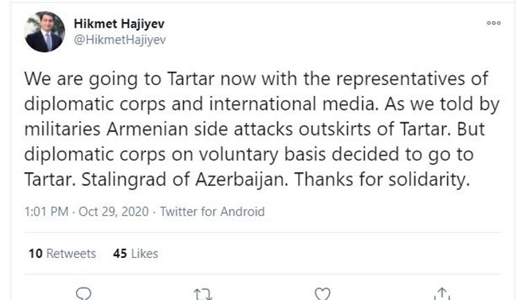 "İndi diplomatik korpus və beynəlxalq media nümayəndələri ilə Tərtərə gedirik. Hərbiçilərin dediyi kimi, erməni tərəfi Tərtər rayonu ətrafına hücum edir. Ancaq diplomatik korpus nümayəndələri könüllü olaraq Azərbaycanın Stalinqradı Tərtərə getməyə qərar verdi. Həmrəylik üçün təşəkkürlər".