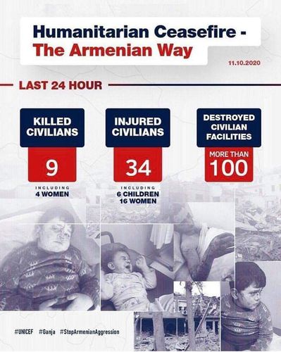 "Bu gecə saat 2 radələrində Gəncə şəhərinə amansızlığına görə misli görünməmiş zərbə endirilib. Əldə olan məlumata görə, raket atəşi nəticəsində 9 nəfər (o cümlədən 4 qadın) həlak olub, 34 nəfər yaralanıb, çoxsaylı mülki obyektlərə ciddi ziyan vurulub.