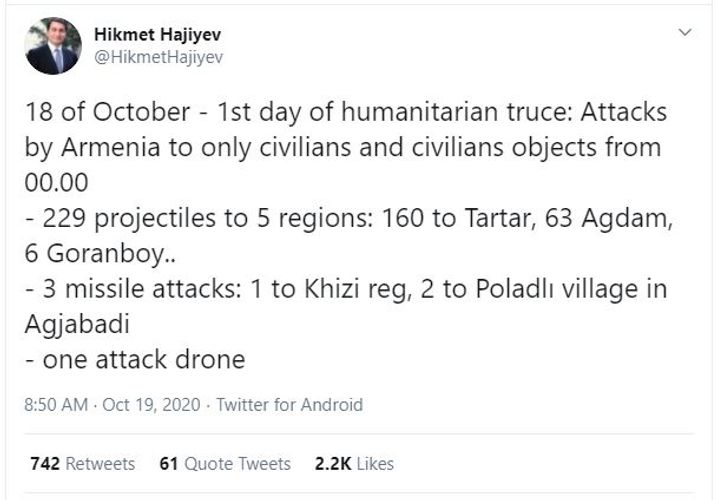 18 oktyabr - humanitar atəşkəsin birinci günü, saat 00.00-dan etibarən Ermənistan silahlı qüvvələri mülki şəxslərə və mülki obyektlərə raket zərbəsi endirib.