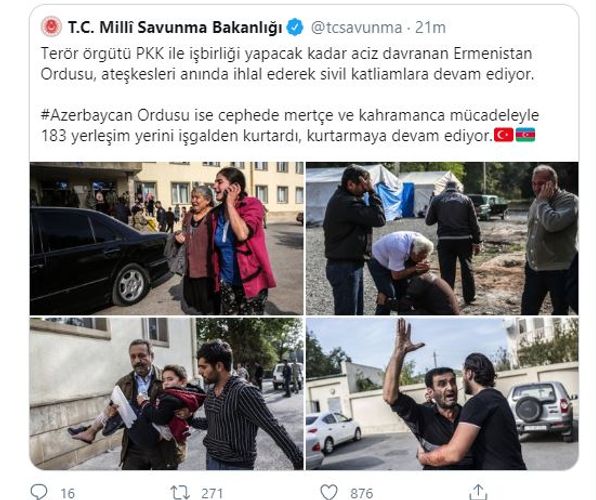 "Terrorçu PKK ilə əməkdaşlıq etmək dərəcədə acizqalan Ermənistan Azərbaycanın mülki əhalisini hədəfə almaqda davam edir".