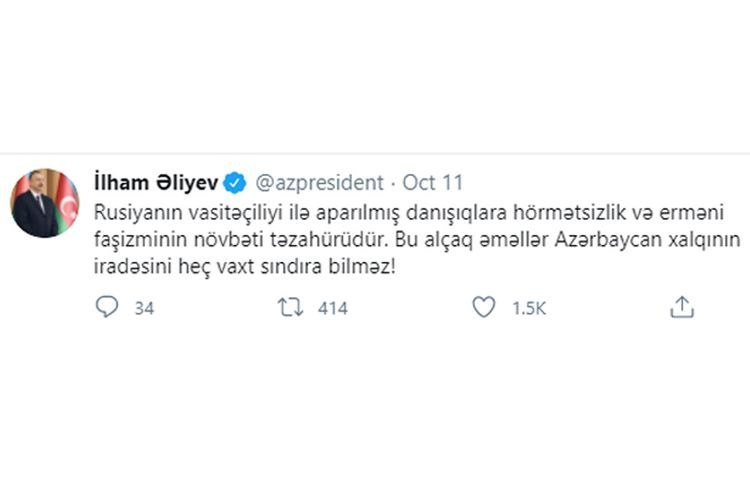 Dövlət başçısı qeyd edib ki, bu alçaq əməllər Azərbaycan xalqının iradəsini heç vaxt sındıra bilməz.