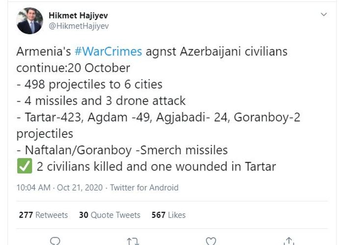 Lent.az xəbər verir ki, H.Hacıyev bu barədə rəsmi "twitter" hesabında bildirib ki, oktyabrın 20-də düşmənin yaşayış məntəqələrimizi və mülki şəxsləri atəşə tutmaqda davam edib: