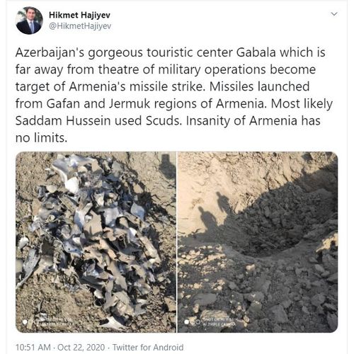 "Azərbaycanın hərbi əməliyyatlar teatrından çox uzaq olan möhtəşəm turizm mərkəzi Qəbələ Ermənistanın raket zərbəsinin hədəfinə çevrilib. Ermənistanın Qafan və Cermuk bölgələrindən raketlər atılıb. Çox güman ki, Səddam Hüseynin vaxtilə istifadə etdiyi Skadlardan atəş açılıb. Ermənistanın ağılsızlığının həddi-hüdudu yoxdur".