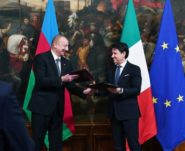 APA-nın xəbərinə görə, Azərbaycan Respublikasının Prezidenti İlham Əliyev və İtaliya Respublikası Nazirlər Şurasının Sədri Cüzeppe Konte “Azərbaycan Respublikası ilə İtaliya Respublikası arasında Çoxölçülü Strateji Tərəfdaşlığın gücləndirilməsinə dair Birgə Bəyannamə”ni mübadilə etdilər.
