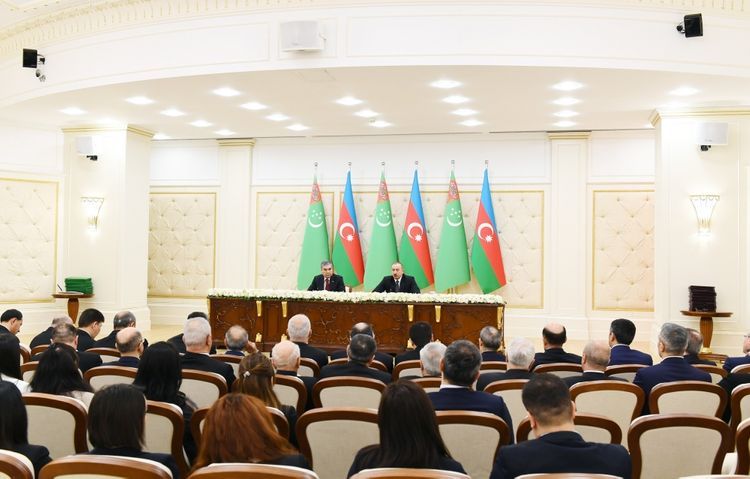 Bizim ikitərəfli münasibətlərə gəldikdə, bu gün biz qarşılıqlı fəaliyyətimizin geniş gündəliyini bir daha nəzərdən keçirdik. Əməkdaşlığımızın strateji inkişafına sadiq qaldığımızı təsdiq etdik və bu gün imzalanmış sənədlər onsuz da çox geniş olan müqavilə-hüquq bazasını tamamlayır. Mənim Türkmənistana rəsmi səfərim zamanı 20-dən çox, bu gün isə 20-yə yaxın sənəd imzalanıb. Bu, ölkələrimiz arasında imzalanmış bütün sənədlərin təxminən yarısı deməkdir. Bu, onu göstərir ki, son ilyarım ərzində biz müqavilə-hüquq bazasının möhkəmlənməsi baxımından çox böyük yol keçmişik.