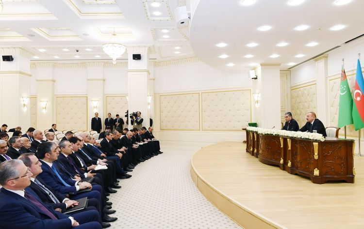Martın 11-də sənədlərin imzalanması mərasimindən sonra Azərbaycan Prezidenti İlham Əliyev və Türkmənistan Prezidenti Qurbanqulu Berdiməhəmmədov mətbuata bəyanatlarla çıxış ediblər.