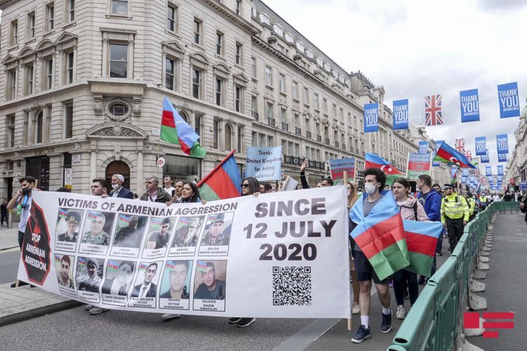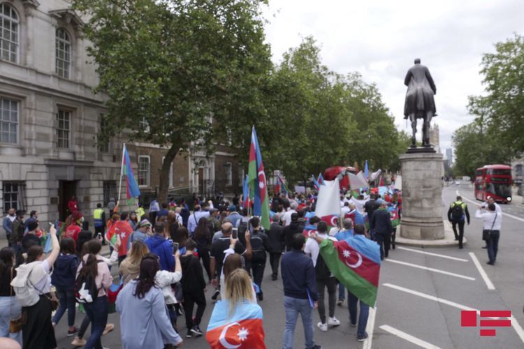 Mitinqin ardından aksiya iştirakçıları BBC-nin yerləşdiyi Portland küçəsindən Parlament binasına doğru yürüş ediblər. Onlar Trafalqar meydanı, Piccadily küçəsindən və Baş nazir Boris Consonun ofisinin yerləşdiyi “Downing Street”in qarşısından keçərək Azərbaycanla bağlı şüarlar səsləndiriblər. Yürüş boyu “Cənab Leytenant”, “Çırpınırdı Qara Dəniz” mahnıları səsləndirilib. Eyni zamanda yürüş iştirakçılarını üzərində ekran quraşdırılmış avtomobil müşayiət edib. Ekranda Azərbaycan torpaqlarının Ermənistan tərəfindən işğal olunduğu barədə məlumatlar, Qarabağ həqiqətlərindən bəhs edən çıxışlar nümayiş etdirilib.