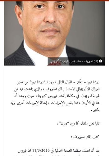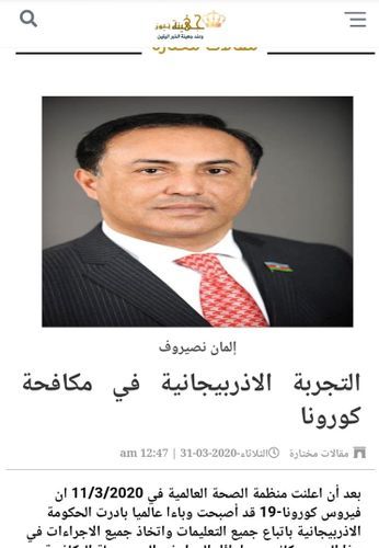 Azərbaycan Respublikası Milli Məclisinin deputatı, YAP-ın Beynəlxalq Əlaqələr Komissiyasının katibi, siyasi elmlər doktoru, professor Elman Nəsirovun “Koronovirus pandemiyasına qarşı qlobal mübarizə: Azərbaycan təcrübəsi” adlı irihəcmli məqaləsi 30-31 mart tarixlərində İordaniya Haşimilər Krallığının rəsmi dövlət saytı olan “Ammon news”, “Deeretna news”, “Alanbat news”, müstəqil saytları olan “Johina news”, “Nəbz”, Fələstinin dövlət saytı olan “Maan news”, “Əlhəyat Əljadida” və bu saytın qəzet versiyasında, habelə Misir Ərəb Respublikasının “Şəbab Əinil“ və “Əlvəsilə news” adlı saytlarında çap olunub.